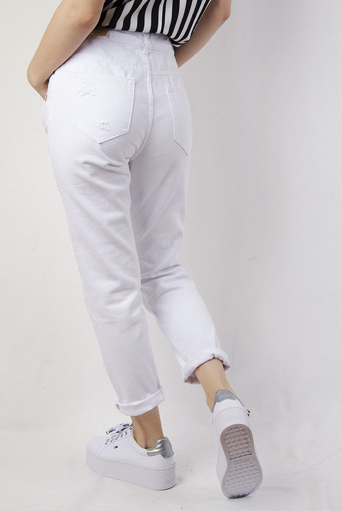Białe spodnie boyfriend z szarpaniami przy nogawce
