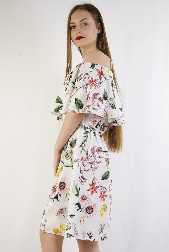 Biała sukienka w kwiatowy wzór z gumką w pasie