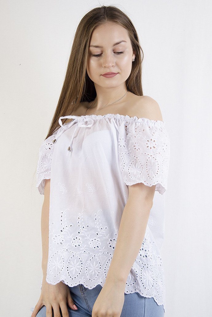 Biała bluzka z ażurowym zdobieniem oraz wiązaniem