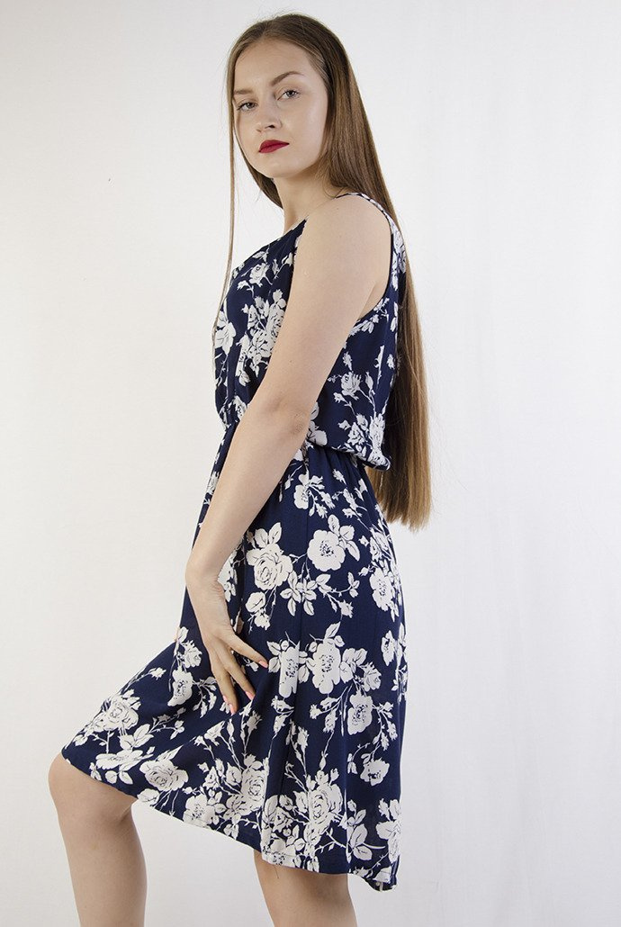 Granatowa sukienka w białe kwiaty z zamkiem z tyłu,