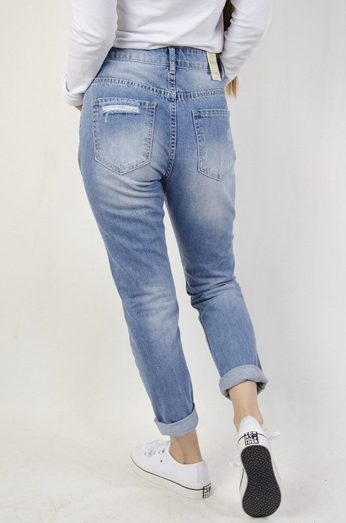 Spodnie jeansowe typu boyfriend z koralikami i przetarciami