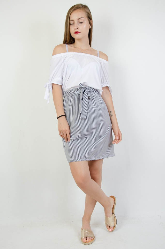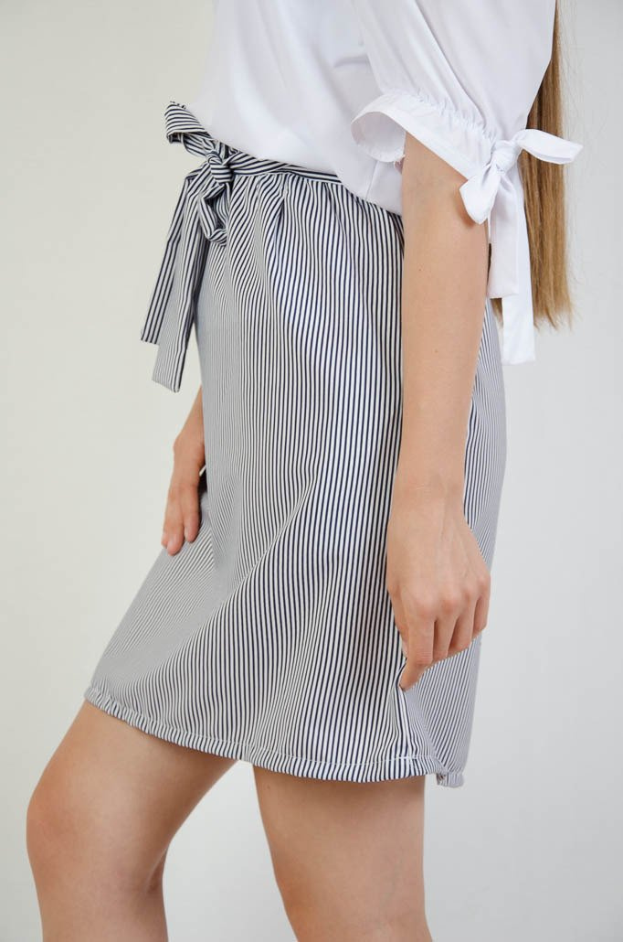 BIAŁO GRANATOWA SPÓDNICA W PASKI Z WIĄZANIEM W PASIE