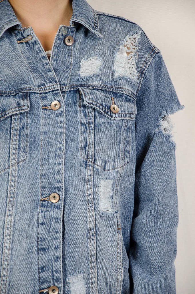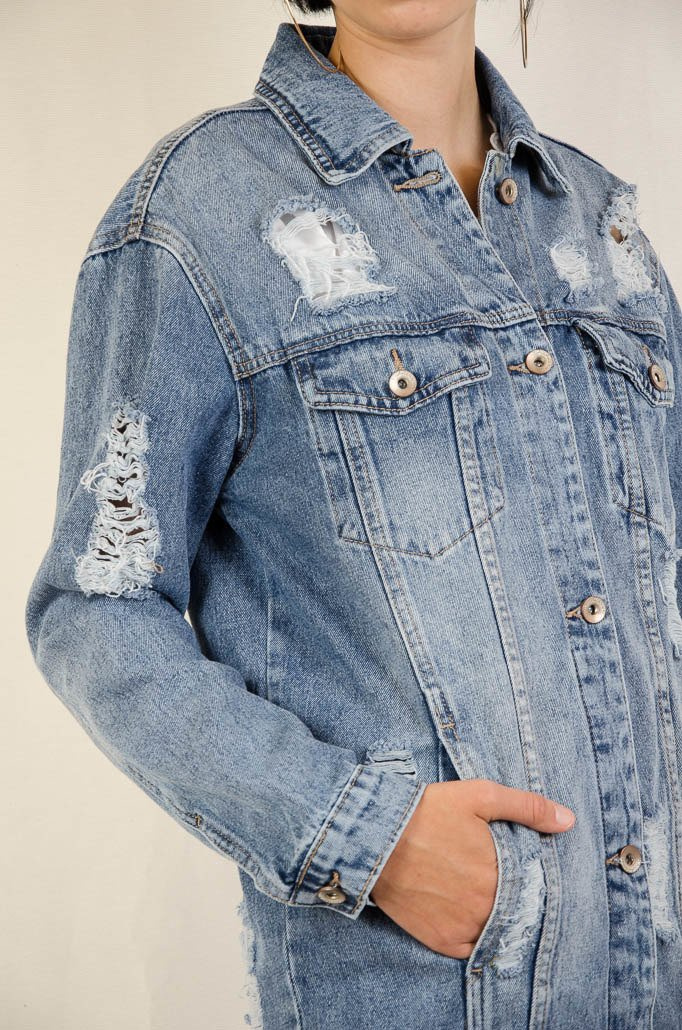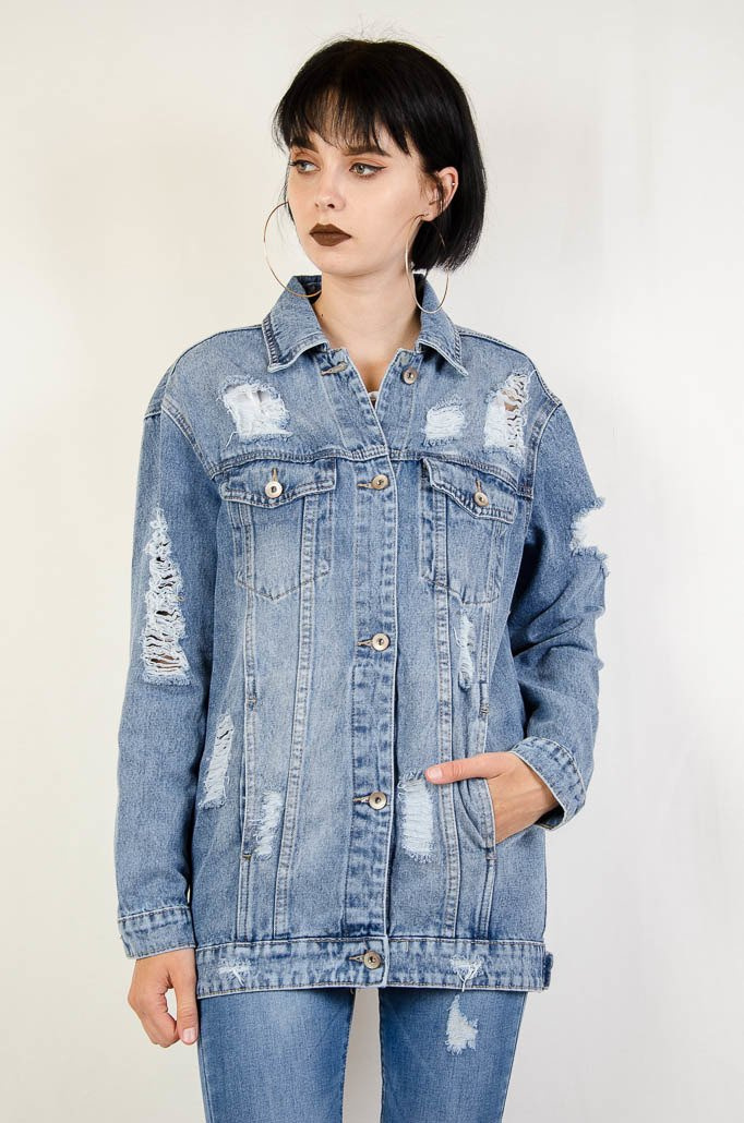 Kurtka jeansowa dłuższa z licznymi przetarciami