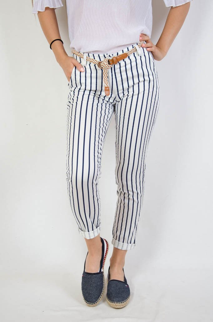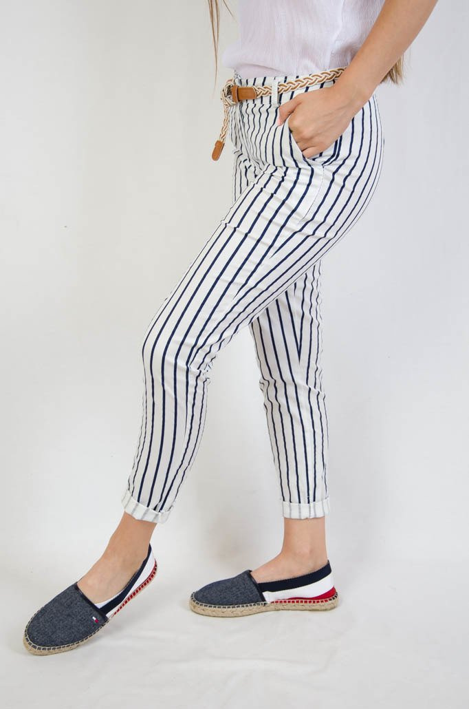 Spodnie materiałowe z paskiem i kieszeniami w cienkie paski