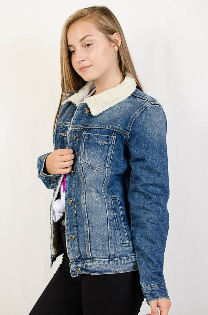 Ciemna kurtka jeansowa z kożuchem na kołnierzu oraz przy guzikach