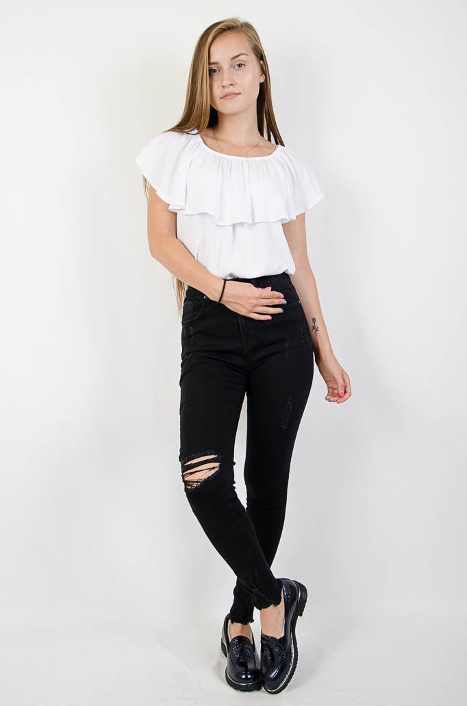 Czarne jeansowe spodnie z przetarciami oraz szarpaniem na dole nogawki