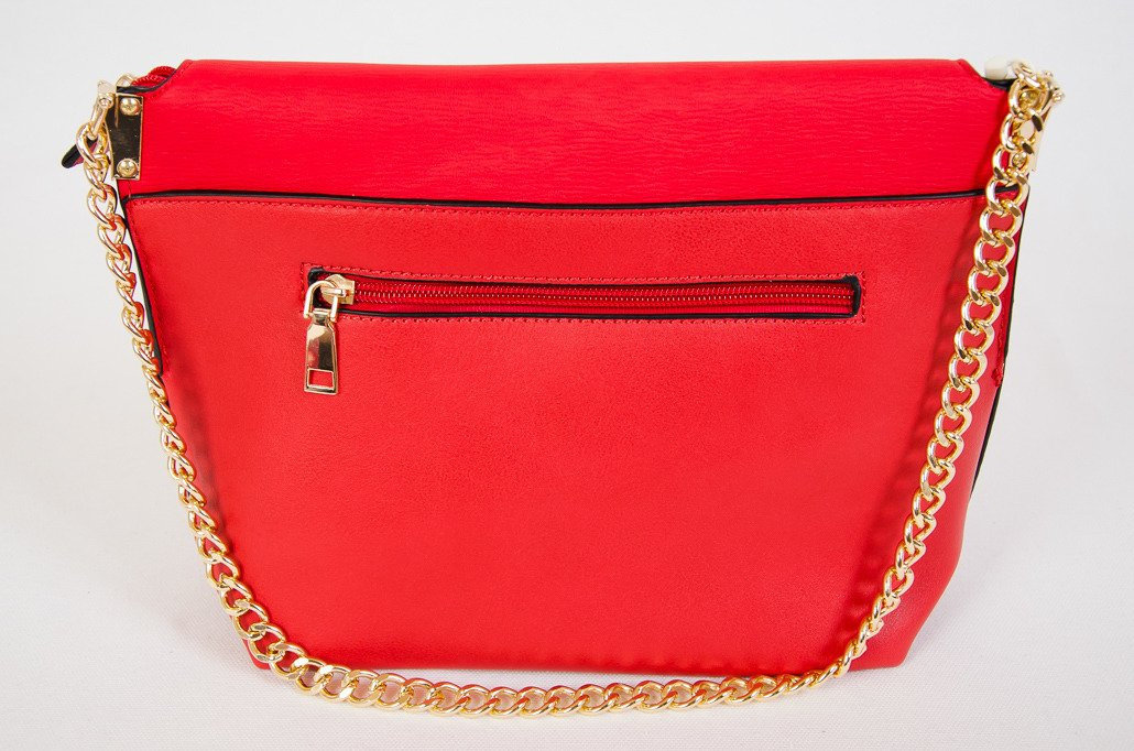 Czerwona kopertowa torebka na złotym łańcuszku
