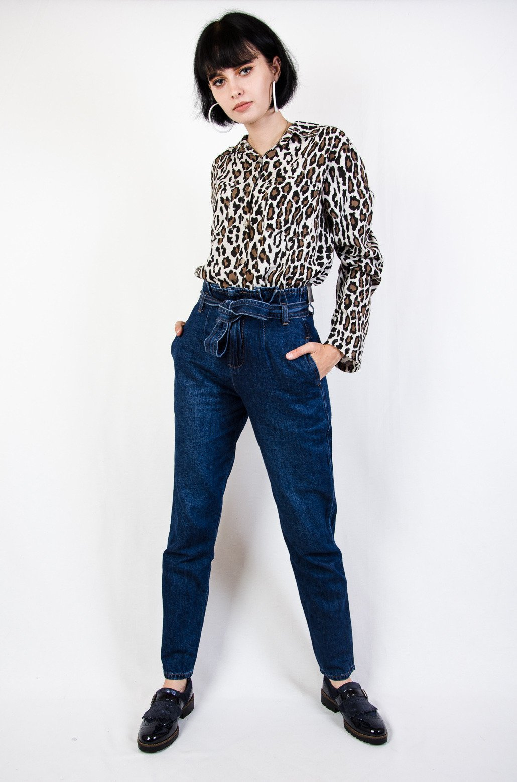 Ciemne jeansowe pumpy z wiązaniem w pasie