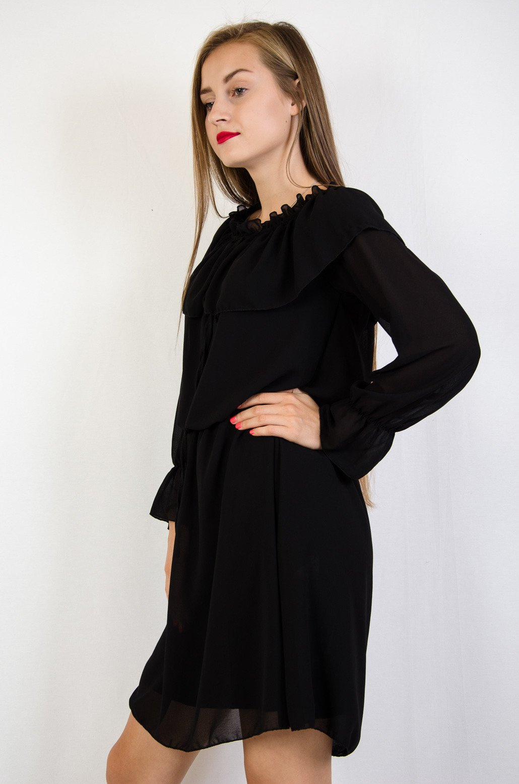 Czarna sukienka na długi rękaw z gumą w dekolcie, z falbanką na górze.