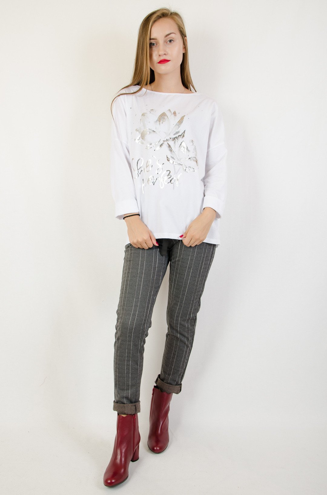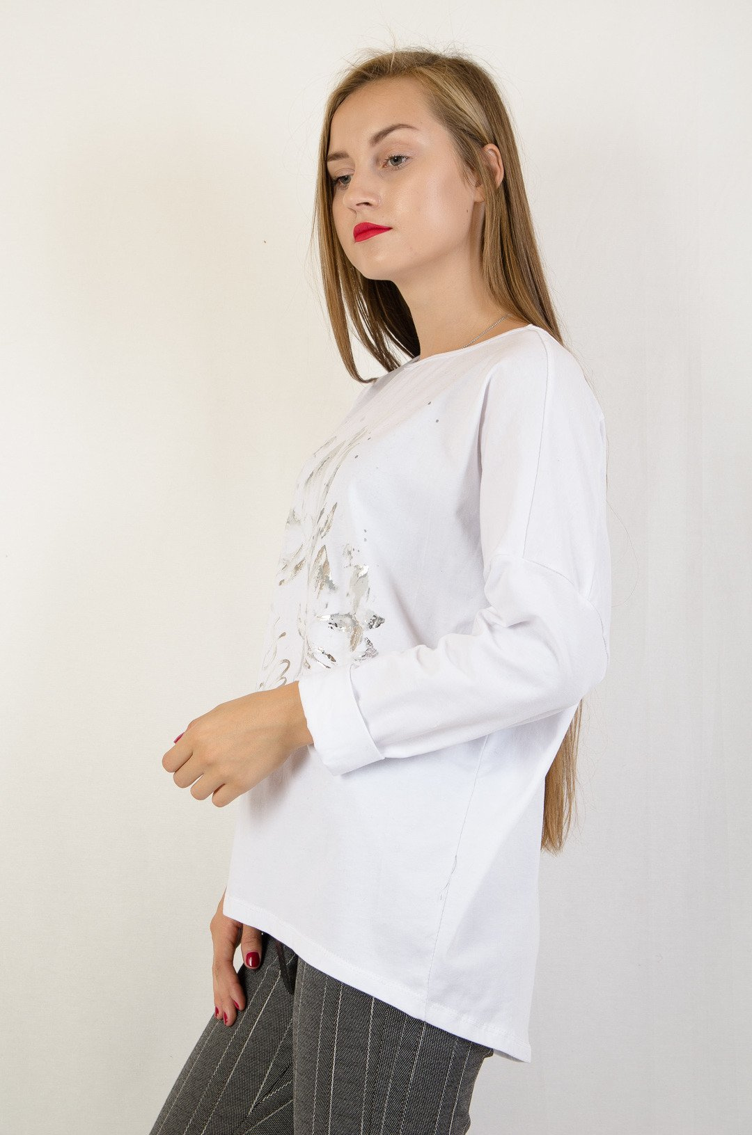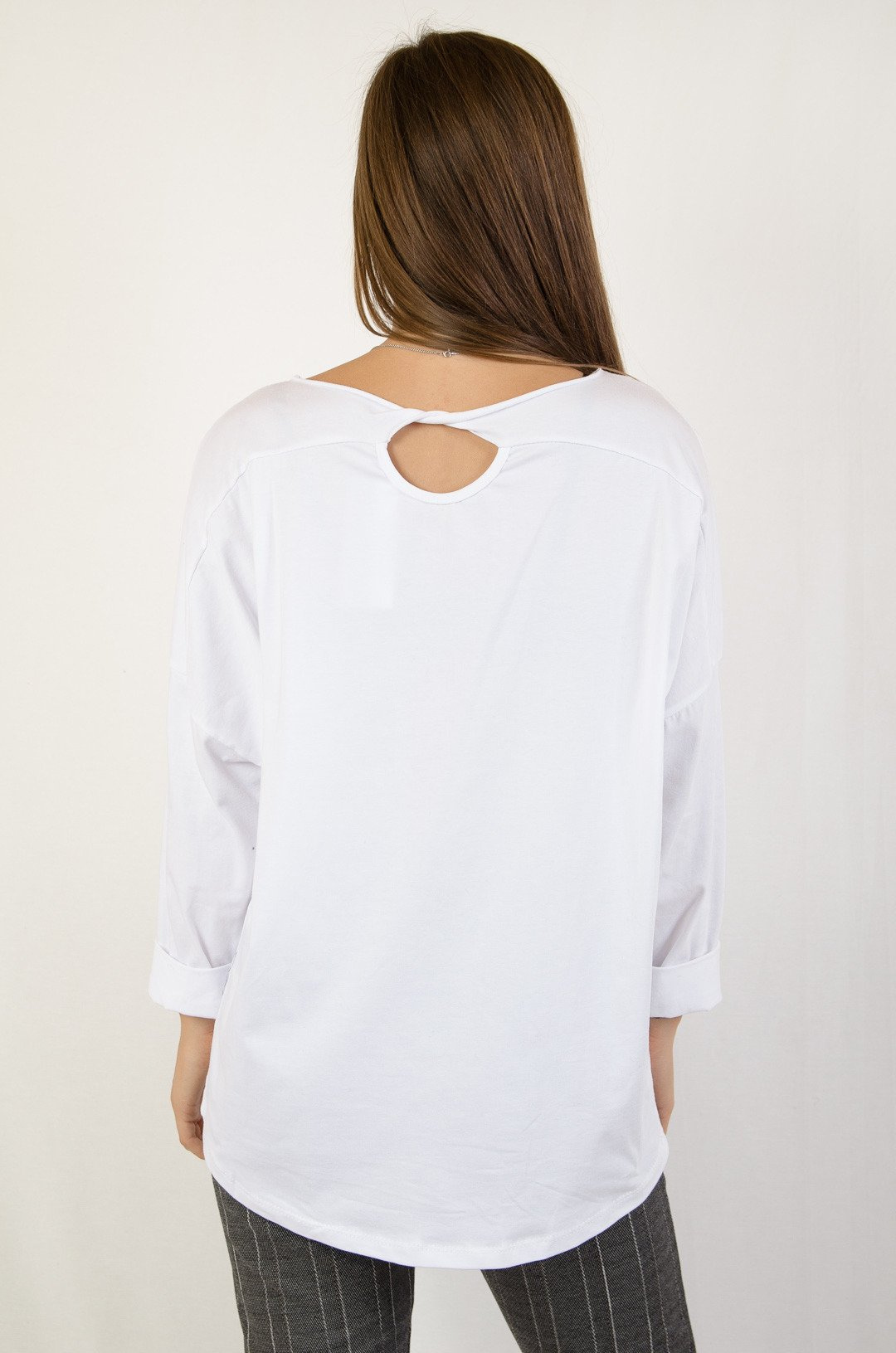 Biała asymetryczna bluzka typu oversize z aplikacja z przodu.