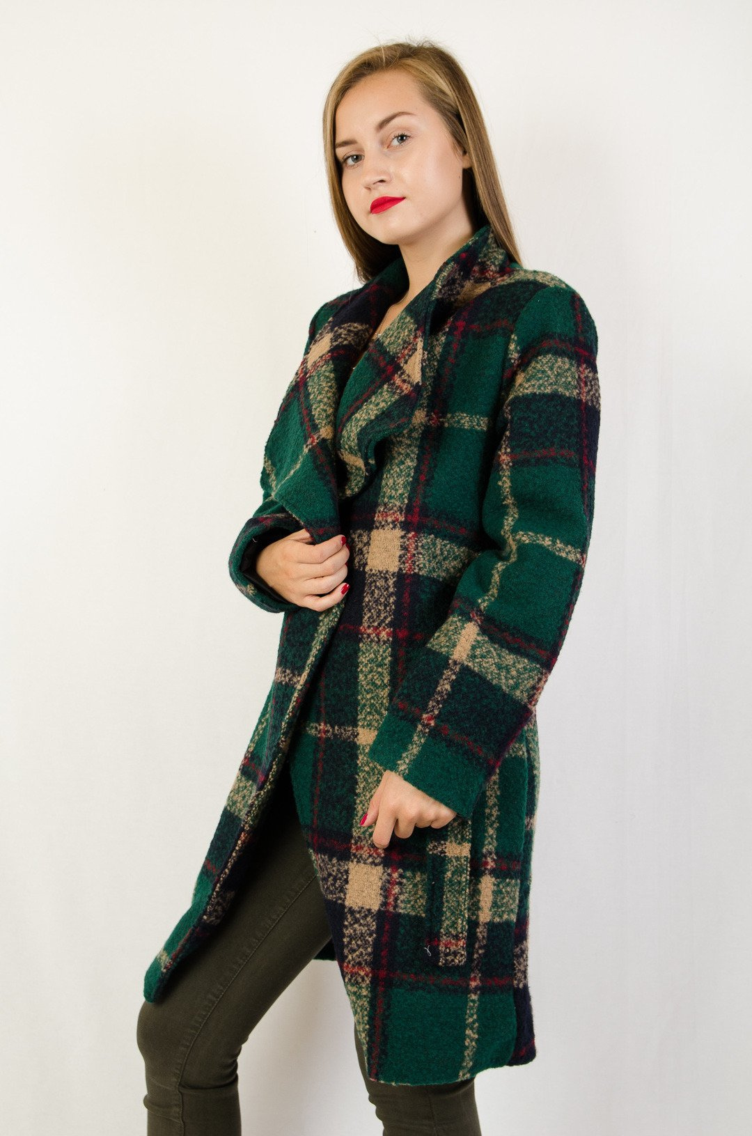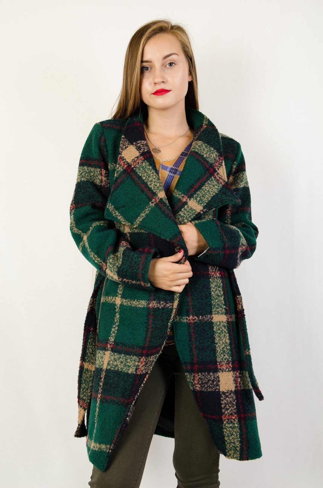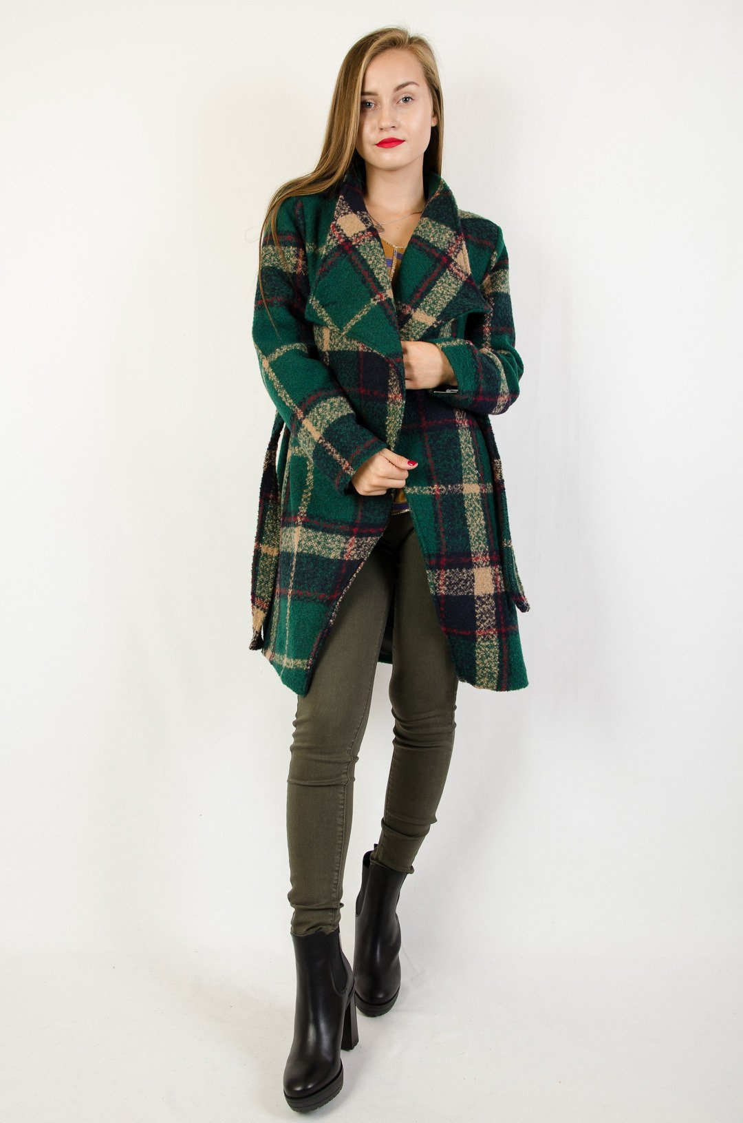 Zielony płaszcz w kratę, z wiązaniem w pasie oraz guzikiem przy szyi