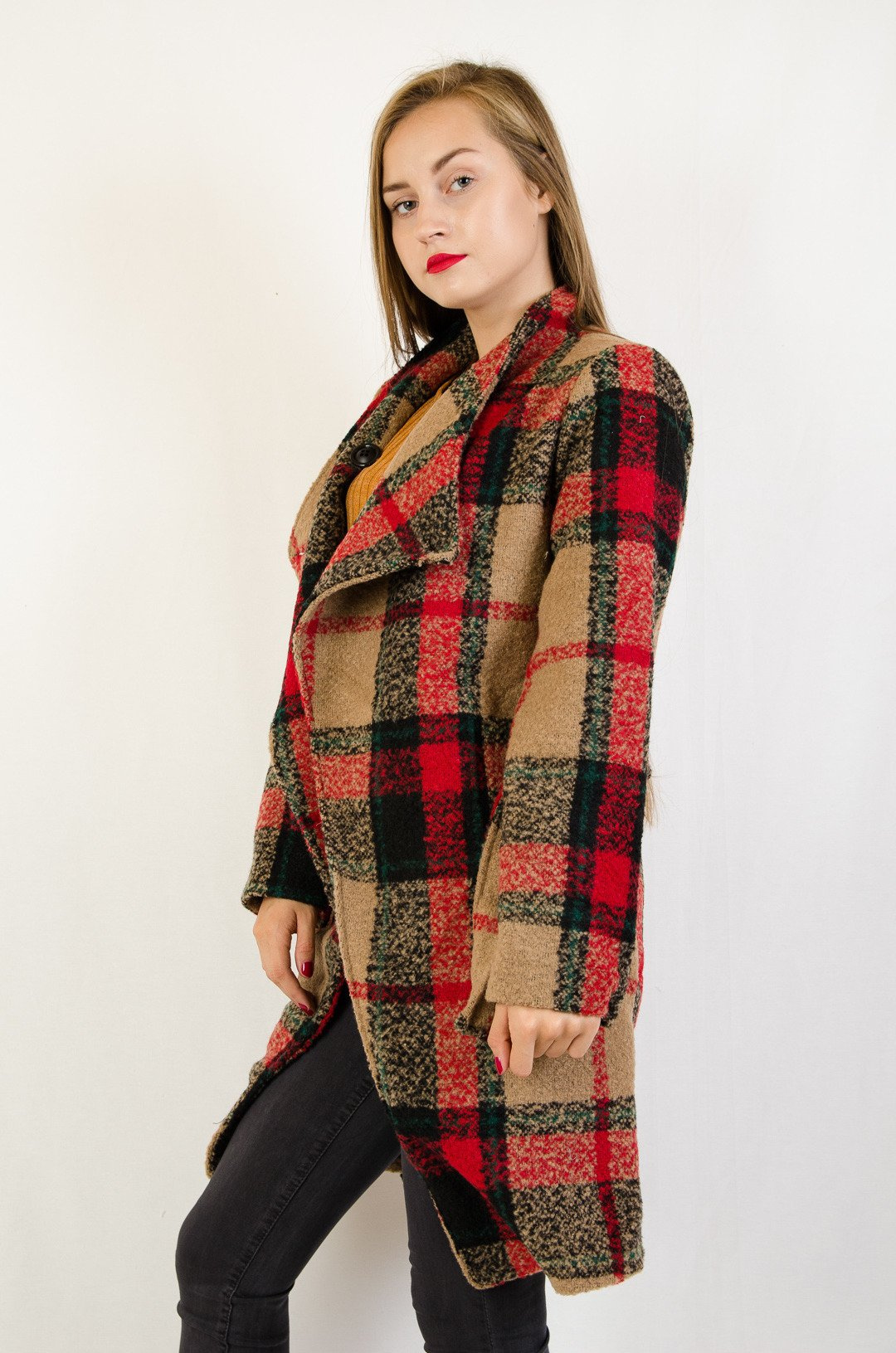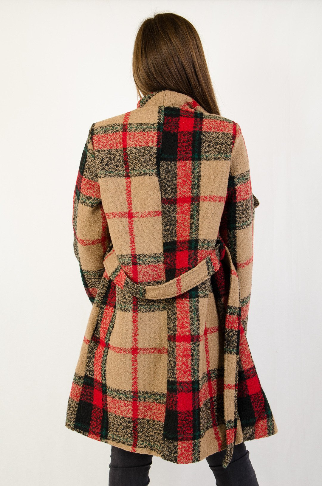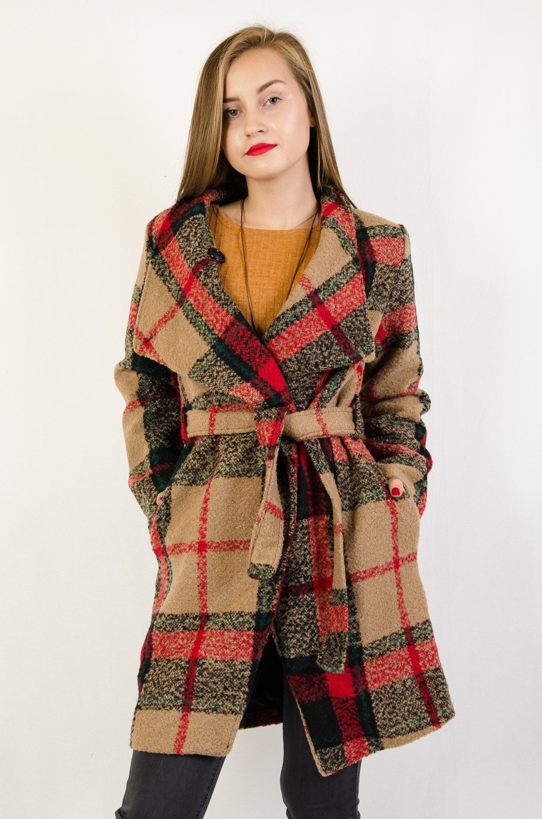 Beżowy płaszcz w kratę, z wiązaniem w pasie oraz guzikiem przy szyi