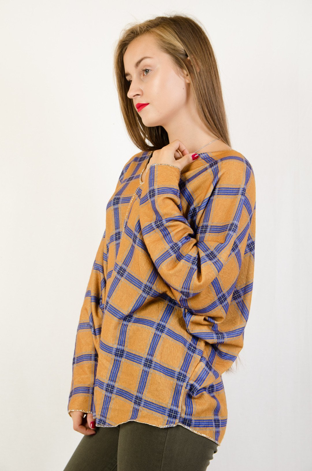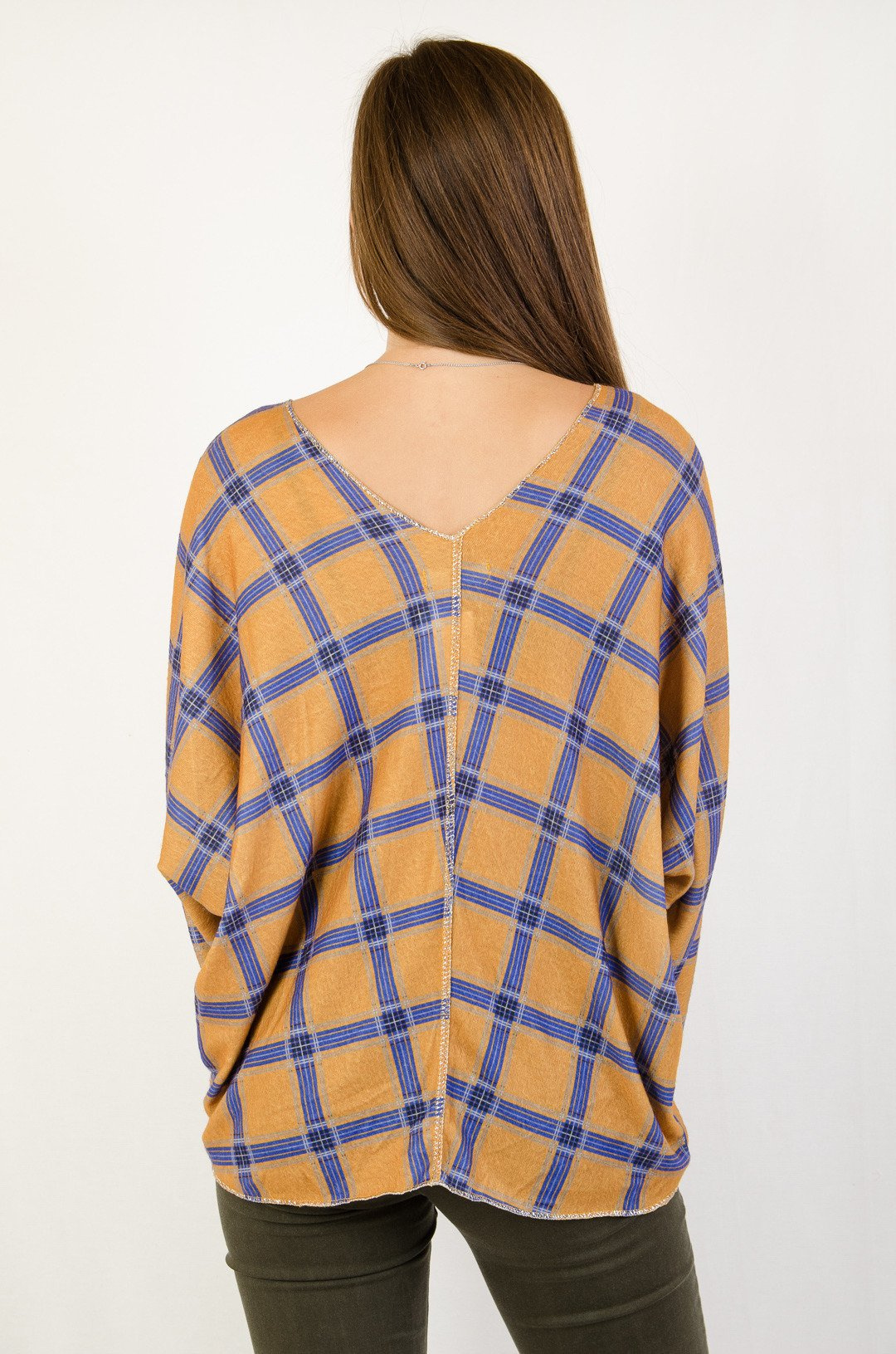 Musztardowa bluzka typu nietoperz w niebieską kratę