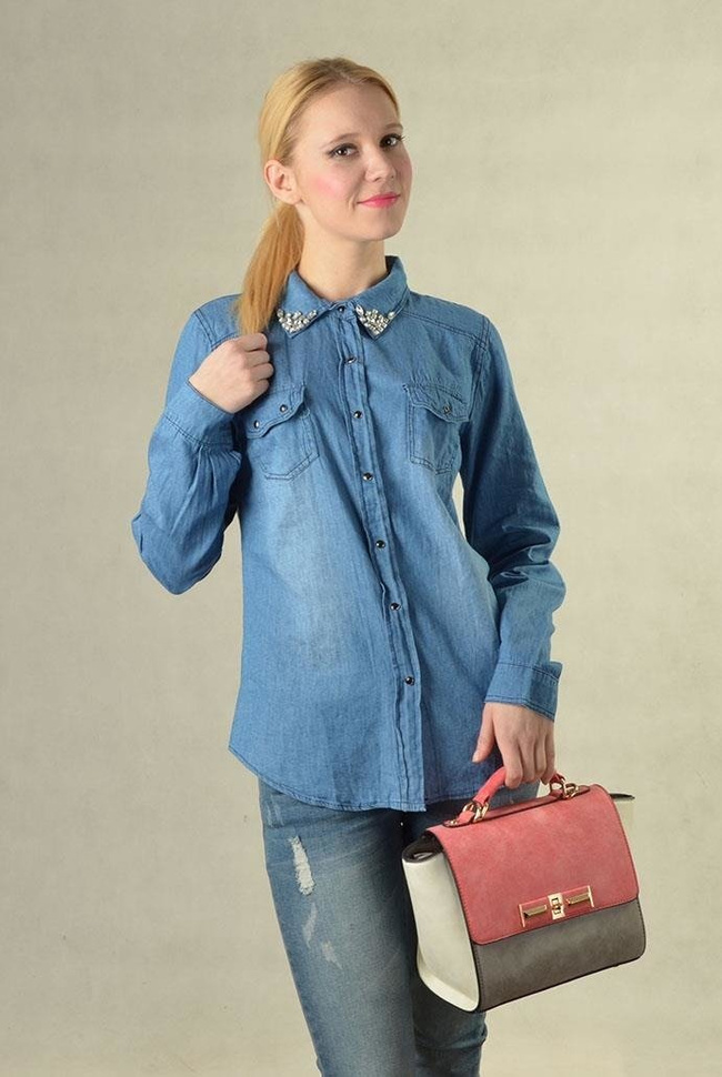 Koszula jeansowa, zapinana na zatrzaski. Kołnierzyk ozdabiany kamieniami.