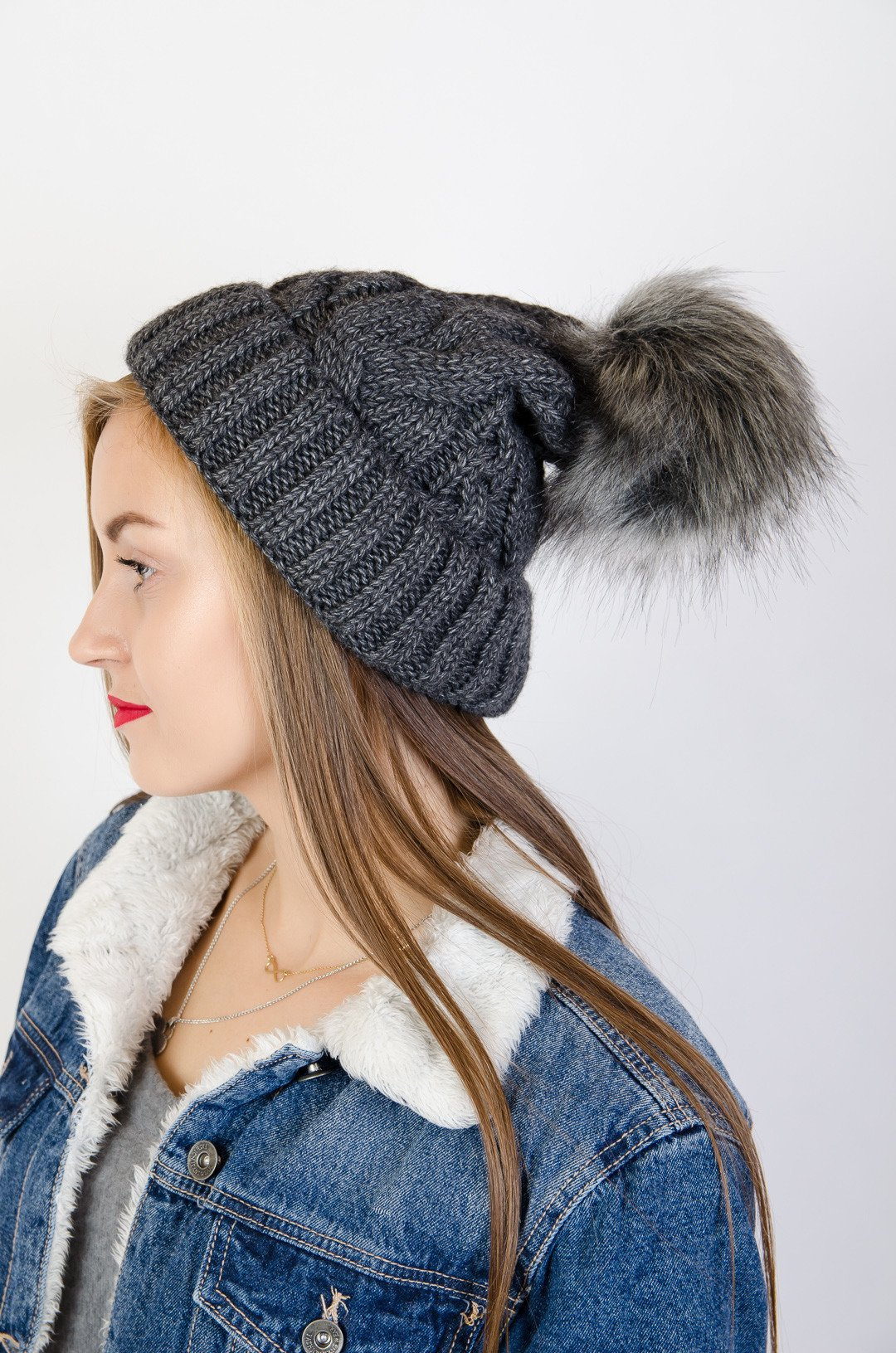 Ciemno szara grubo pleciona czapka z pomponem