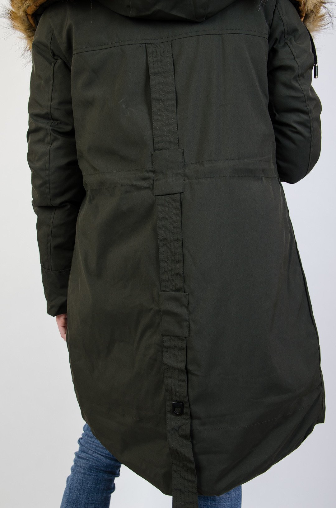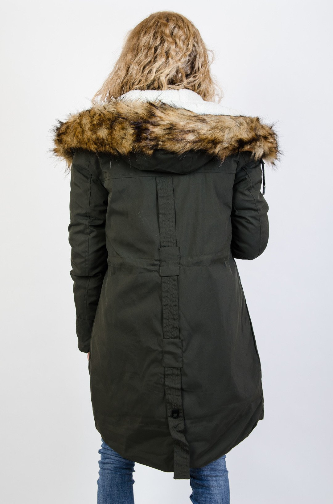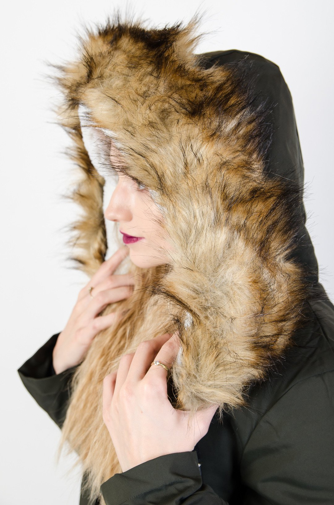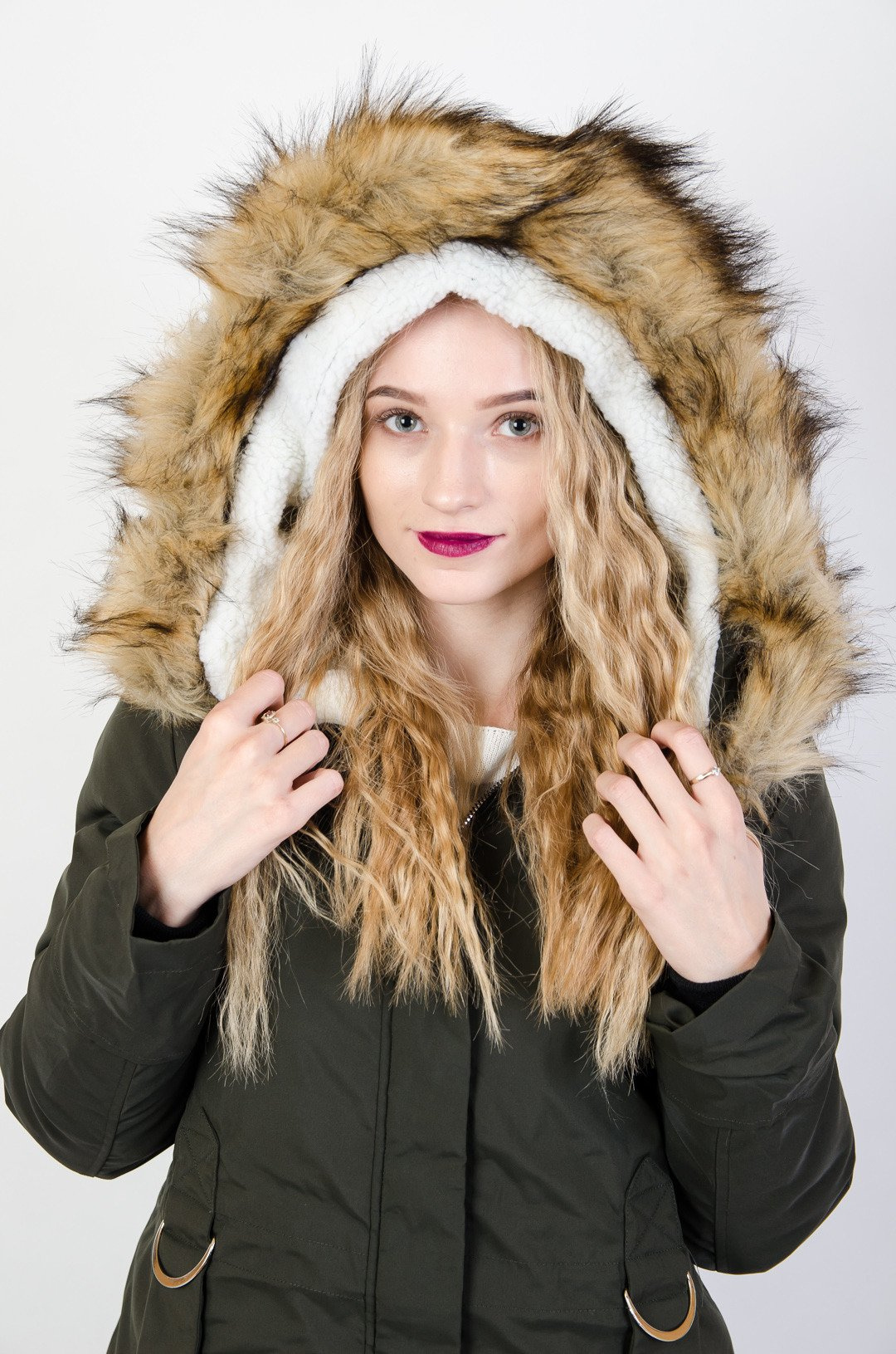Zielona kurtka ocieplana ze ściągaczem w tali. Możliwe jest odpięcie futerka przy kapturze.
