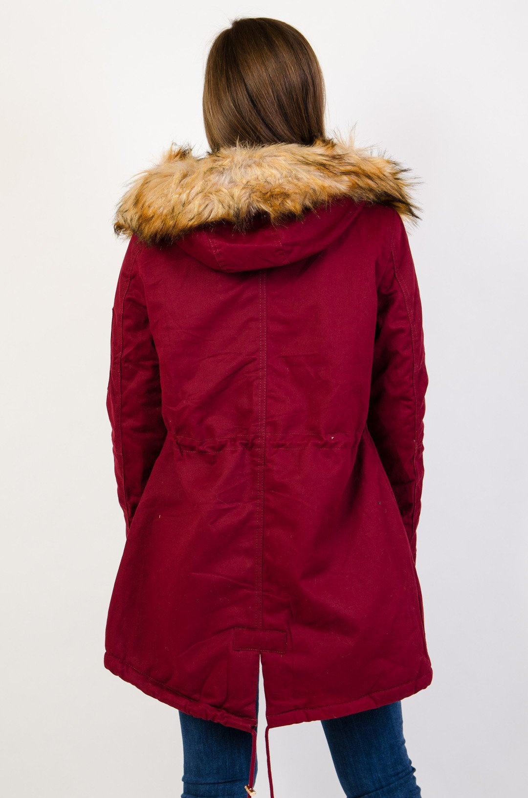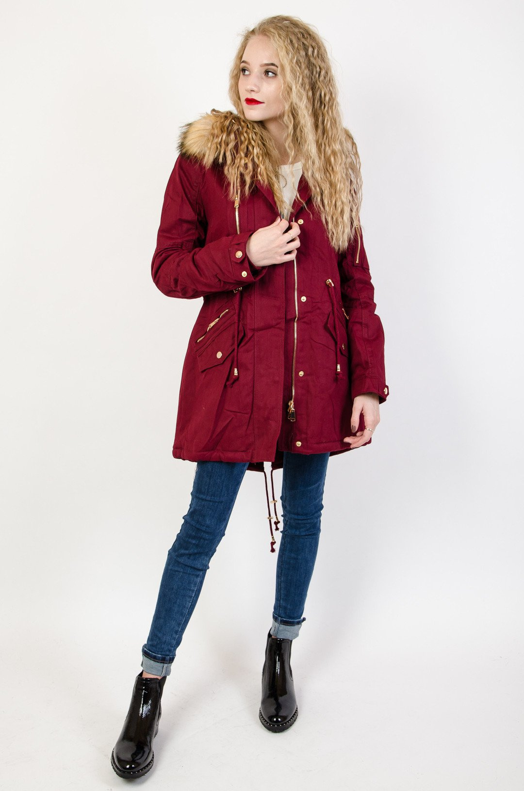 Bordowa asymetryczna kurtka ze złotymi zamkami