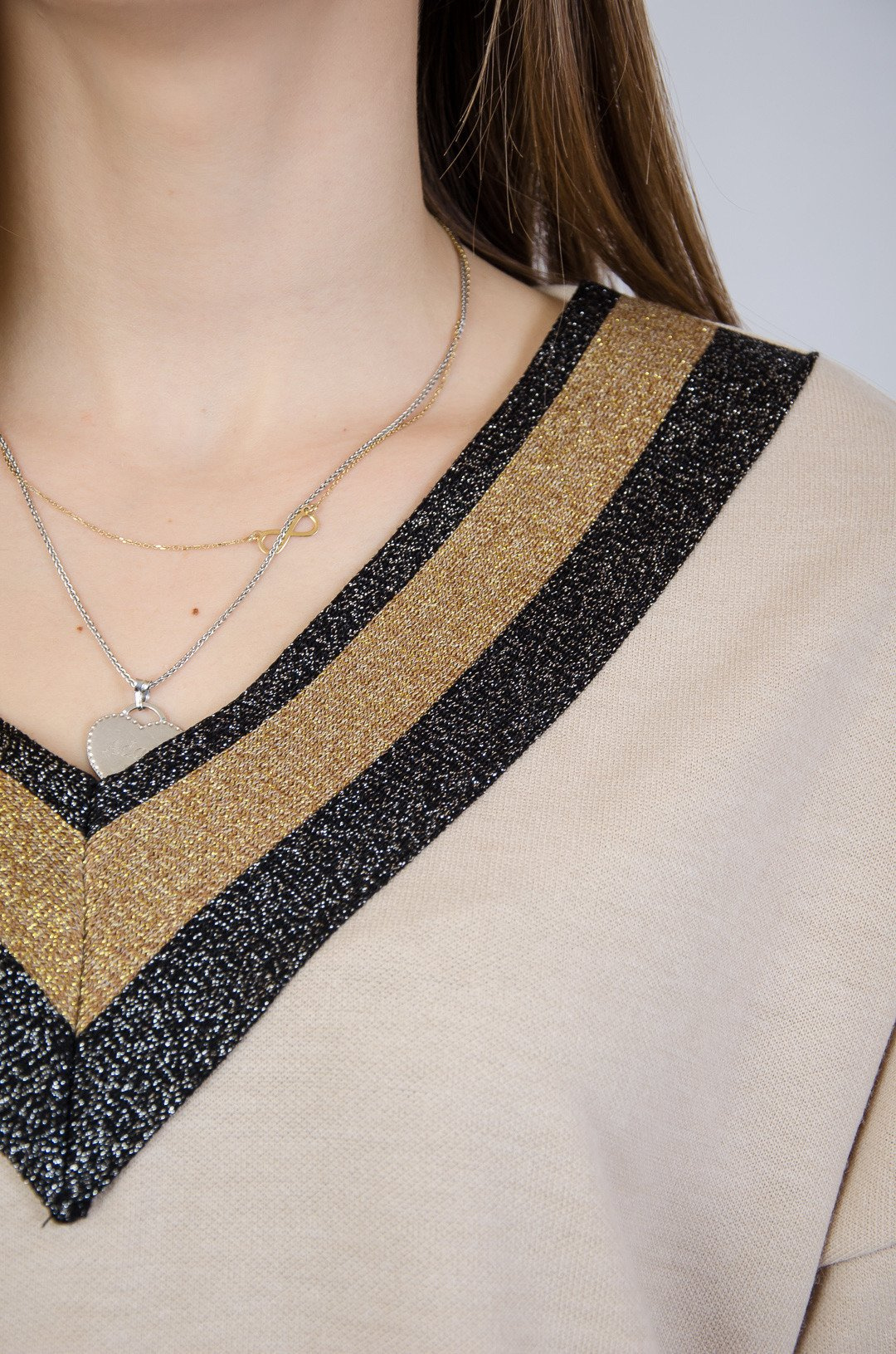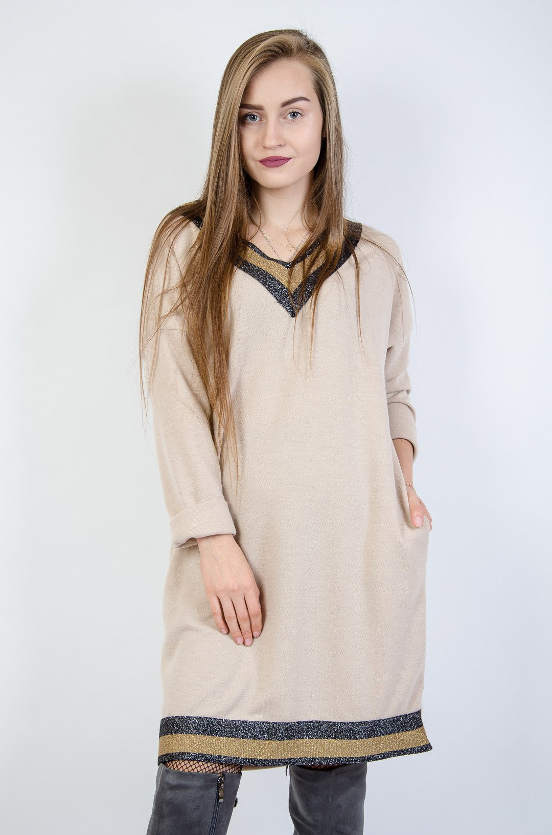 Beżowa sukienka zakończona brokatowymi elementami z kieszeniami