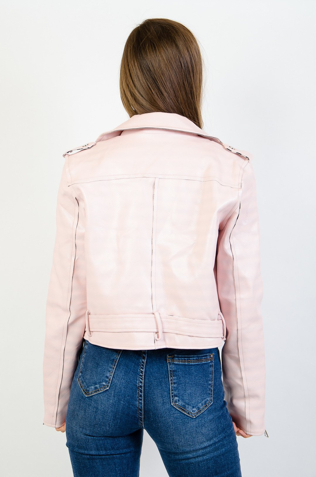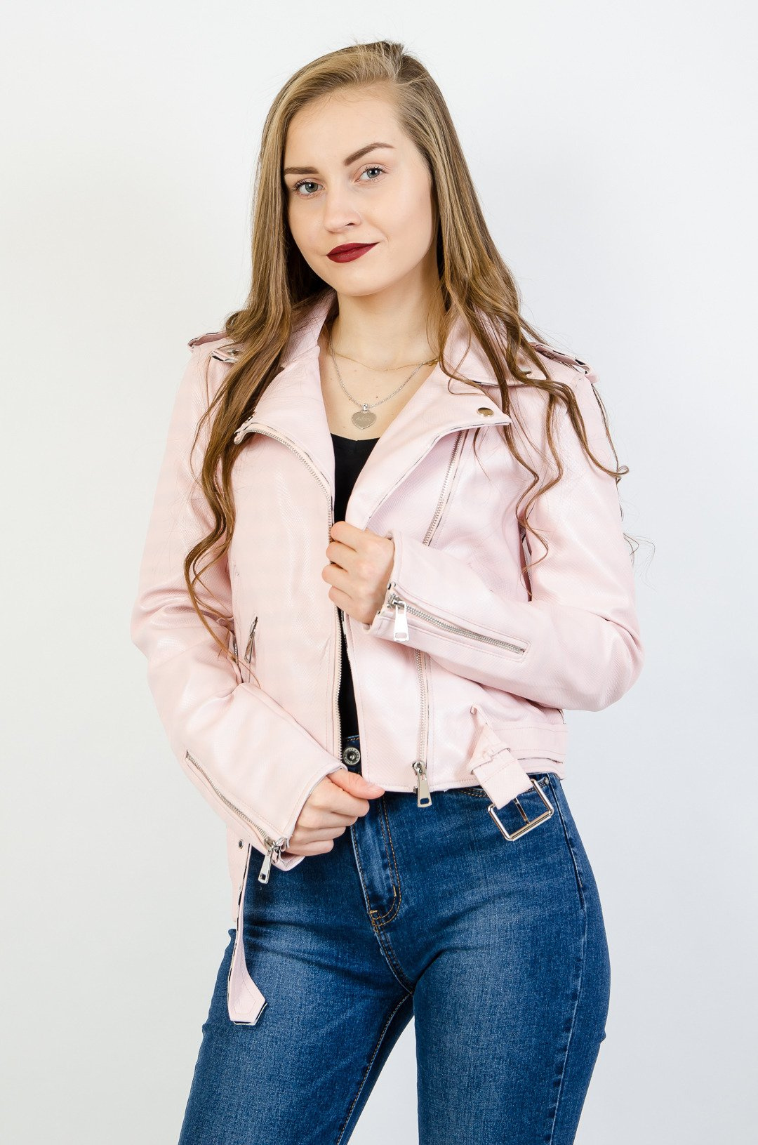 Różowa kurtka ramoneska z zamkami przy rękawach