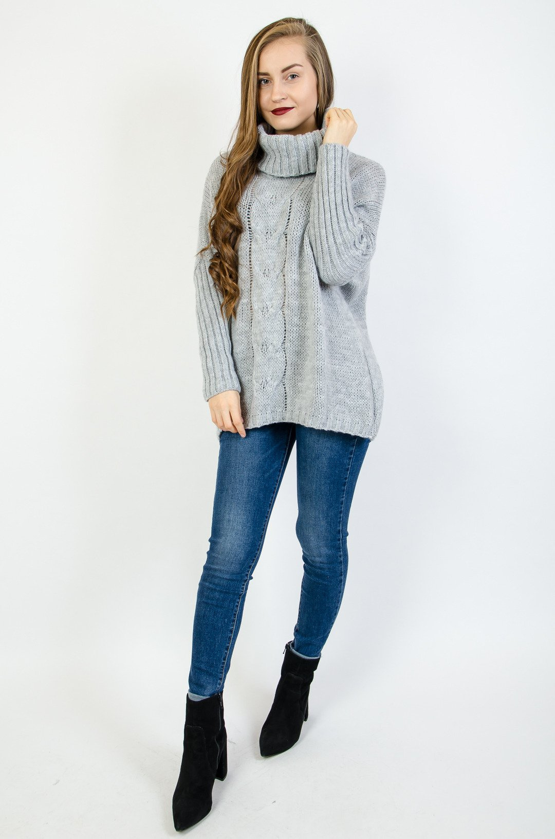 Szary asymetryczny sweter typu nietoperz z golfem
