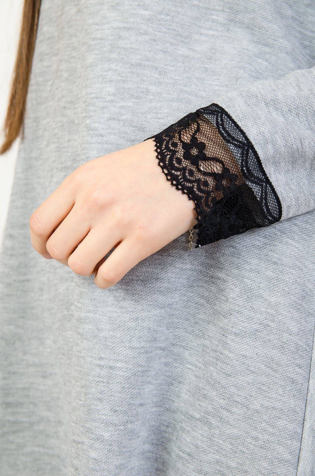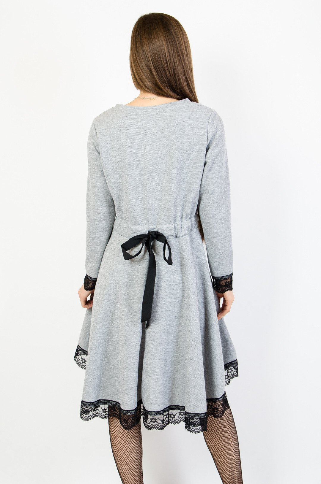 Szara sukienka z przedłużanym tyłem zakończona koronką.