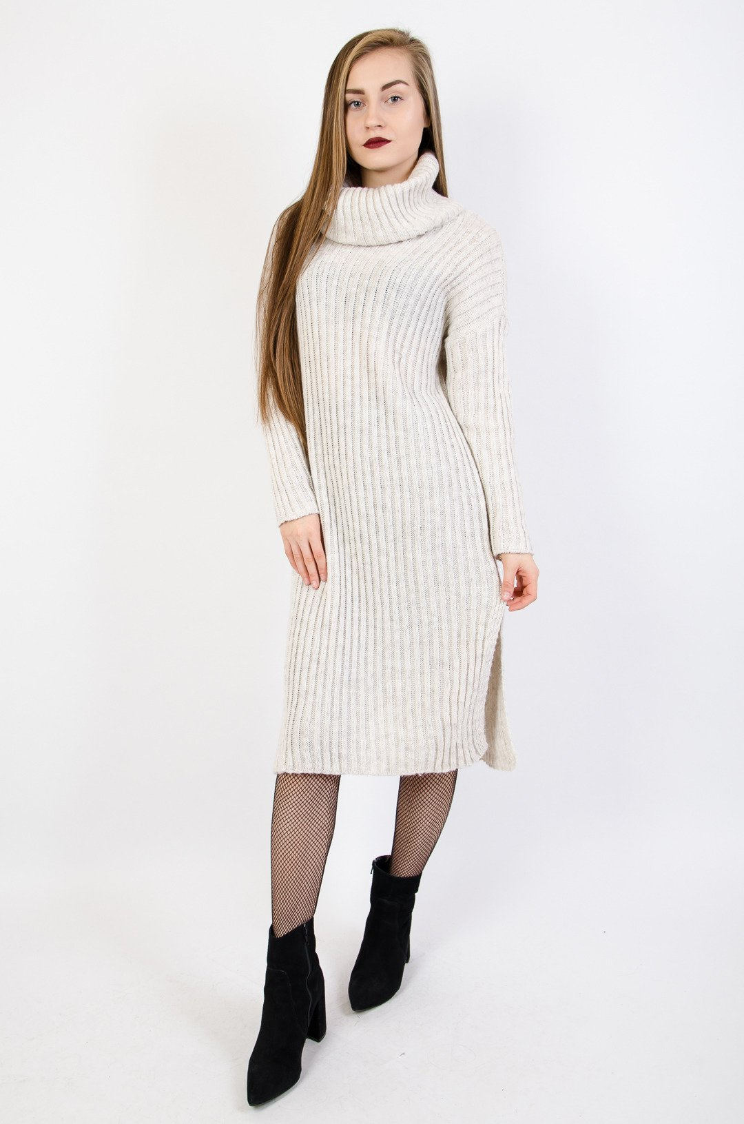 Beżowa ciepła sukienka maxi z golfem oraz rozcięciami po bokach.
