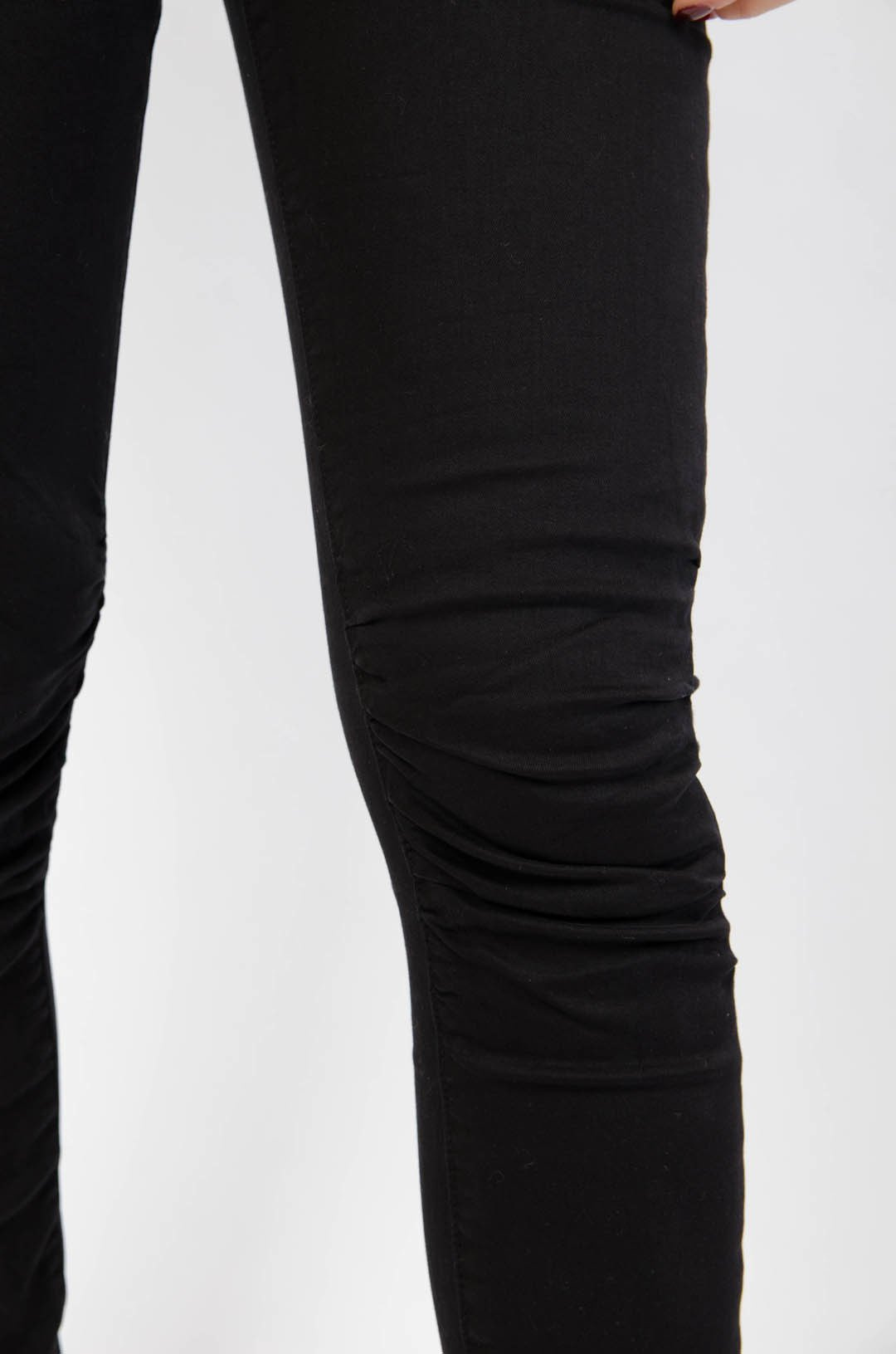 Czarne spodnie jeansowe z gumą w pasie oraz marszczeniem na kolanach.