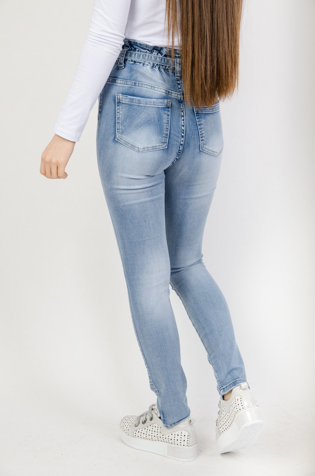 Jasne spodnie z wysokim stanem wiązane w pasie