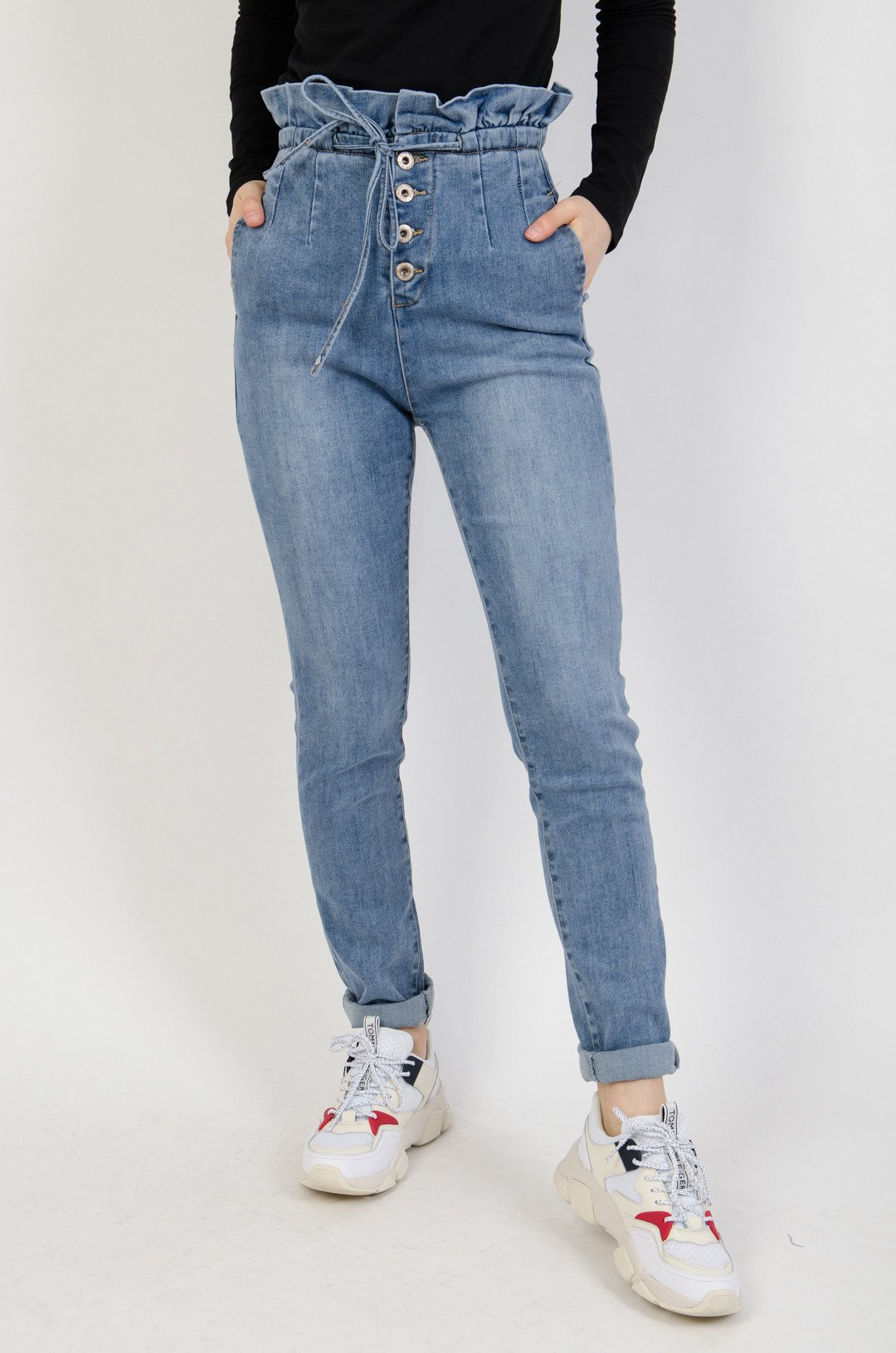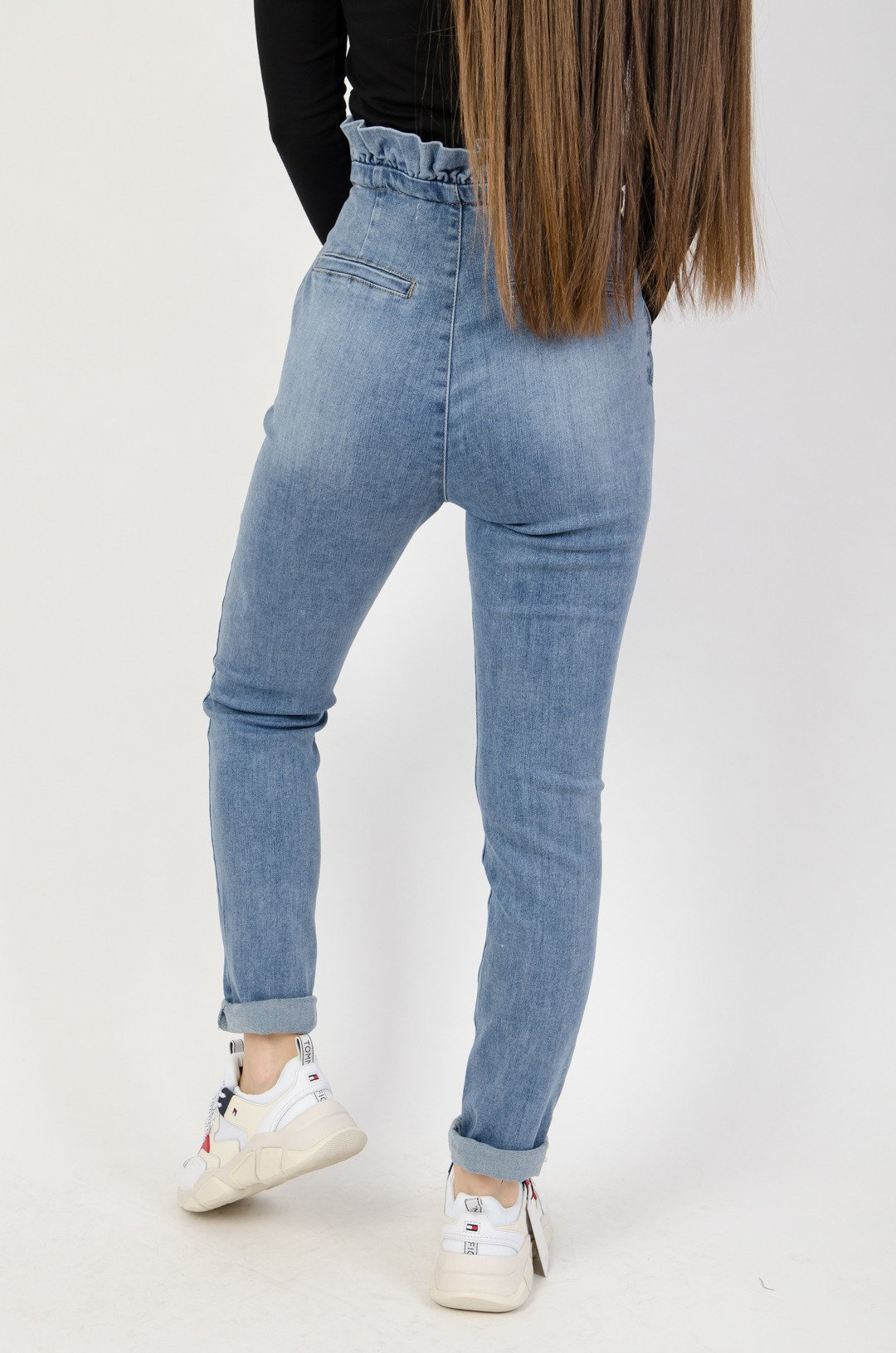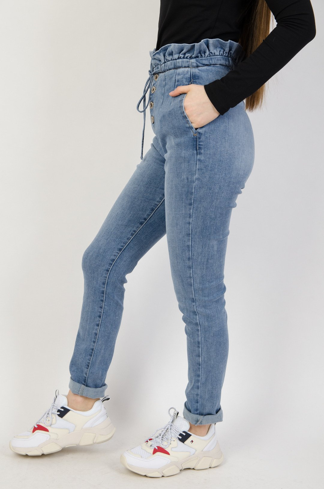 Jasne spodnie jeansowe haremki z falbaną w pasie