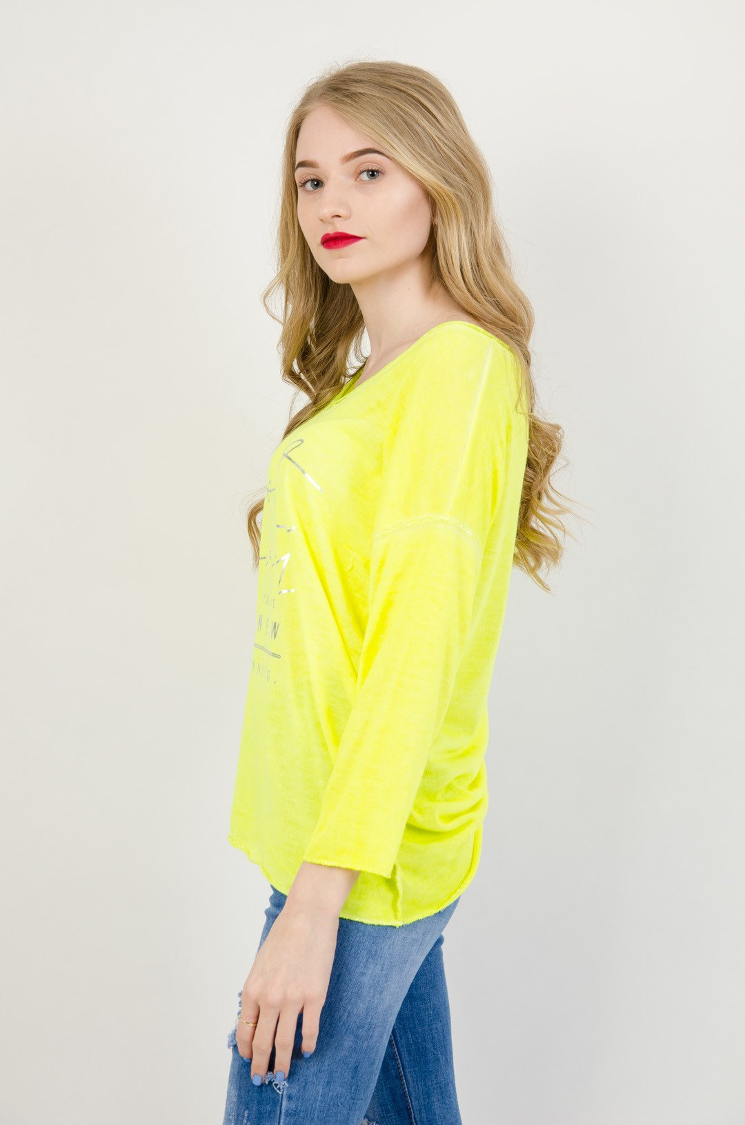 Żółta neonowa bluzka wyszywana srebrną nicią z napisem