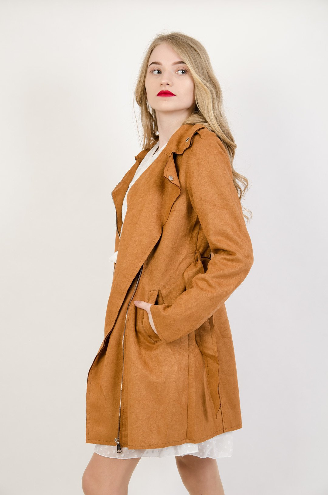 Brązowy zamszowy płaszcz z zamkiem z boku oraz paskiem.