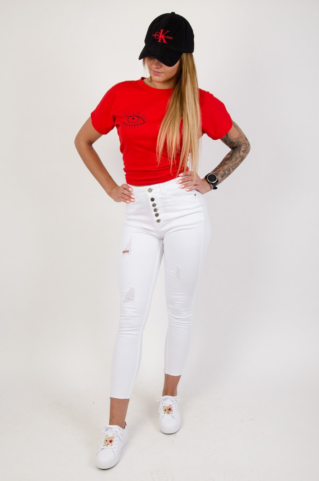 Białe spodnie jeansowe z przetarciami zapinane na guziki