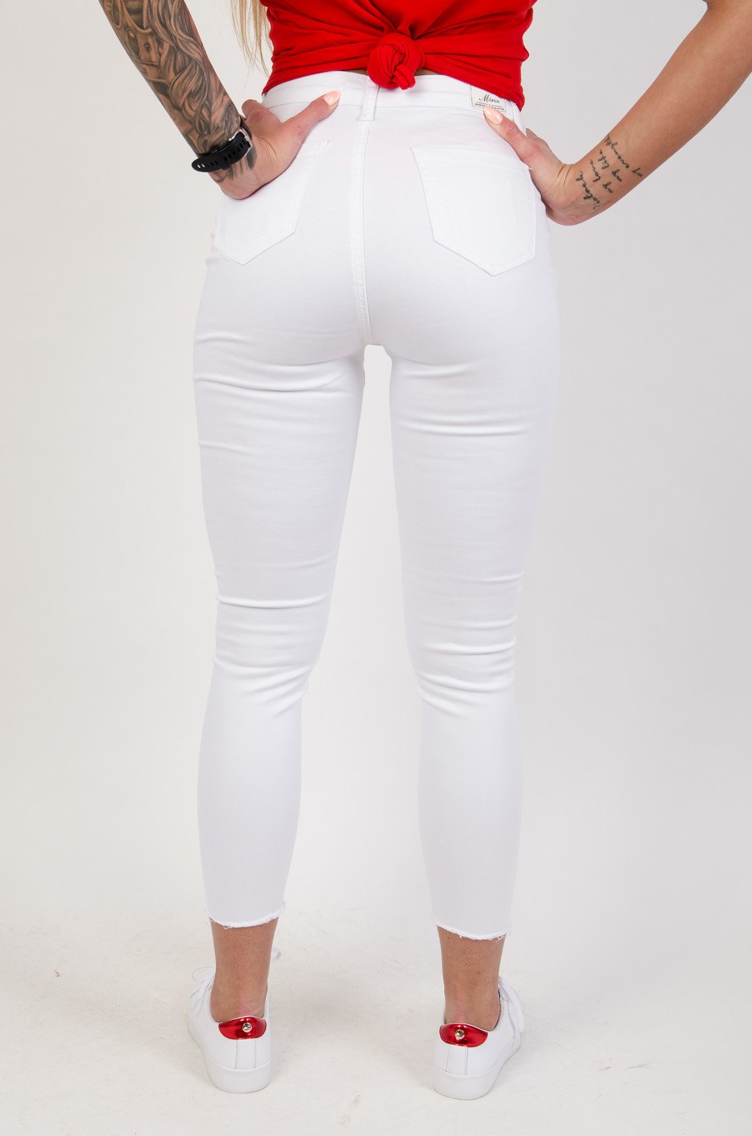 Białe spodnie jeansowe z przetarciami zapinane na guziki.