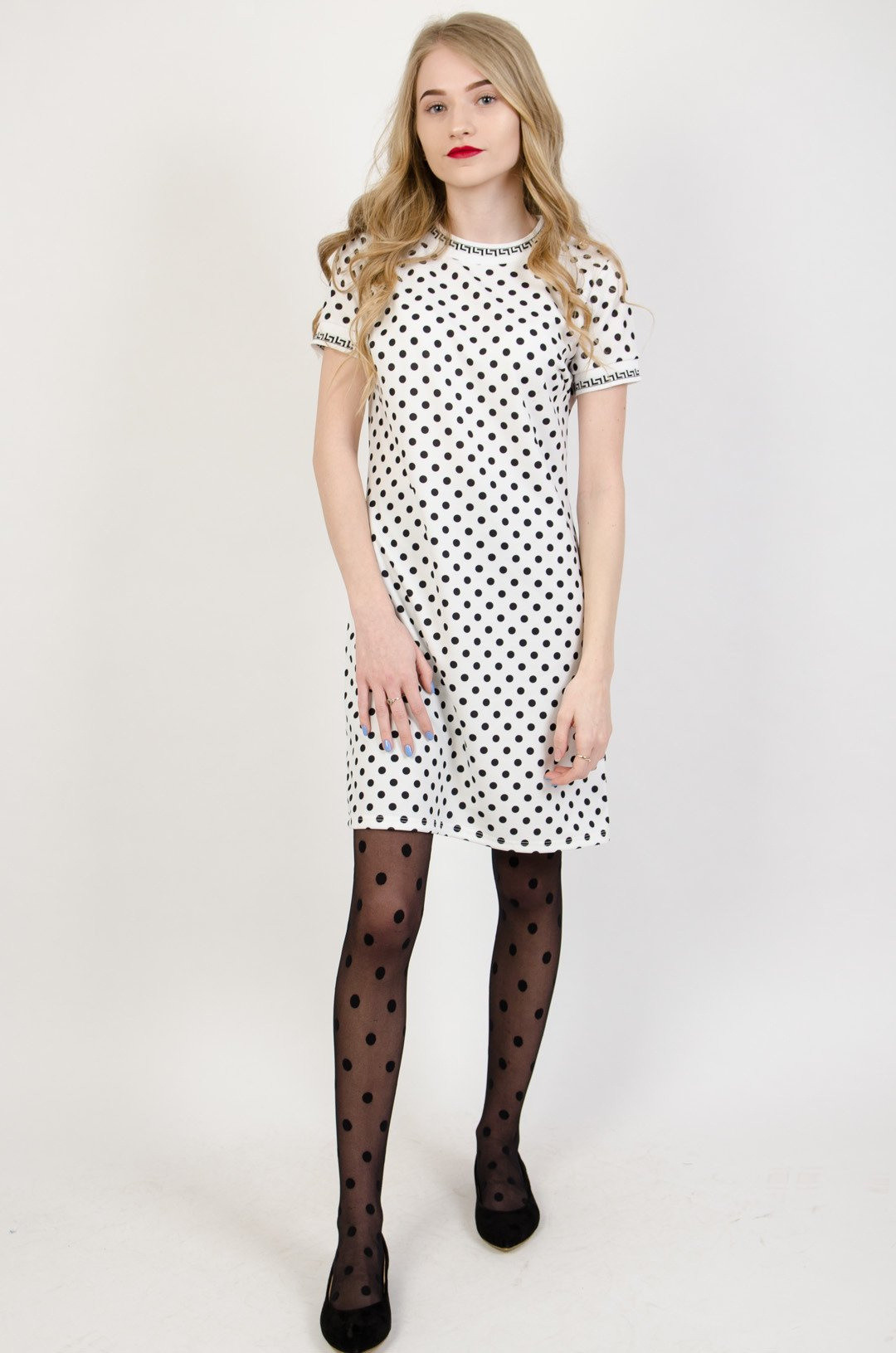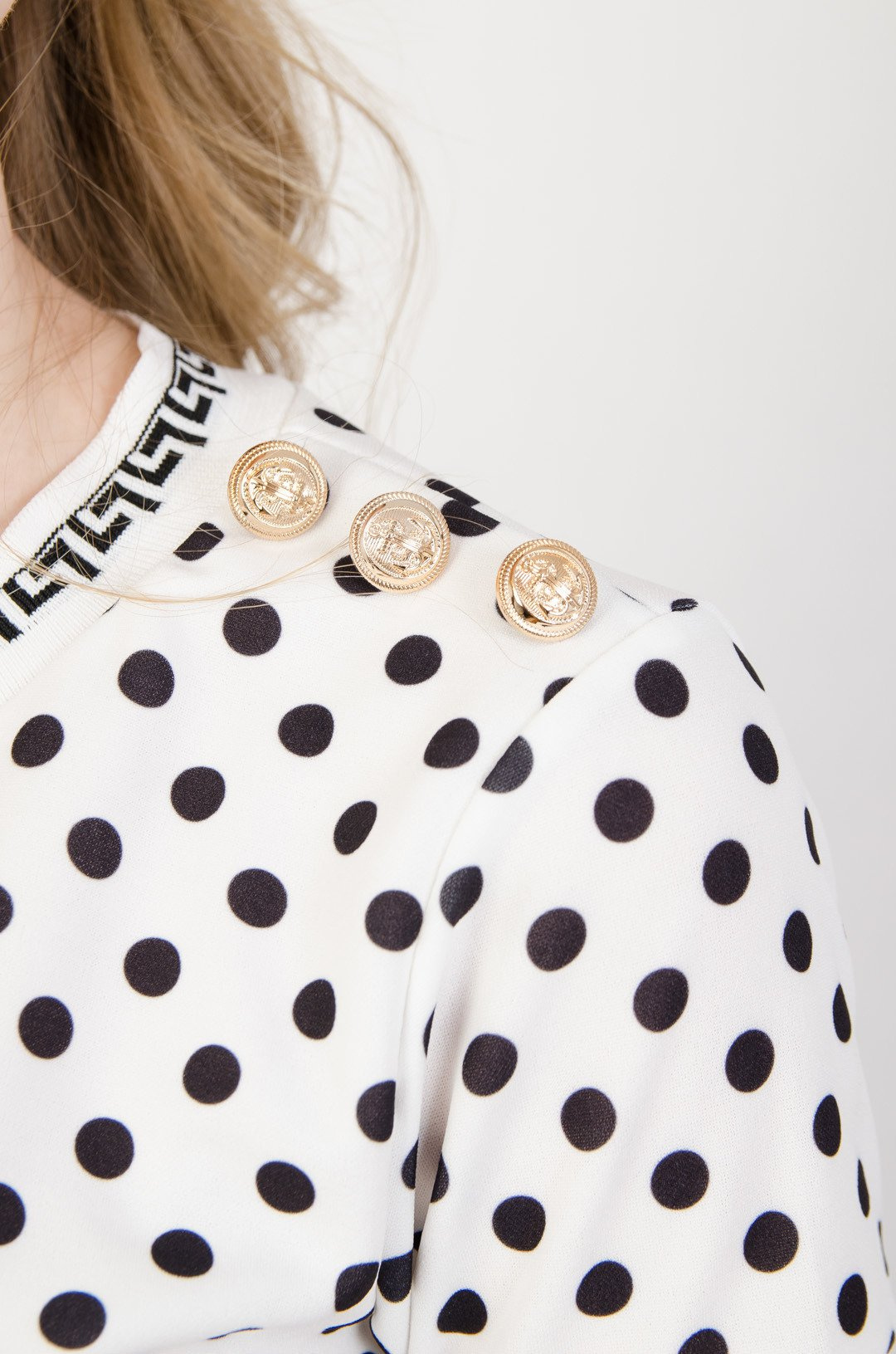 Biała sukienka o prostym kroju w czarne grochy i złotymi guzikami.