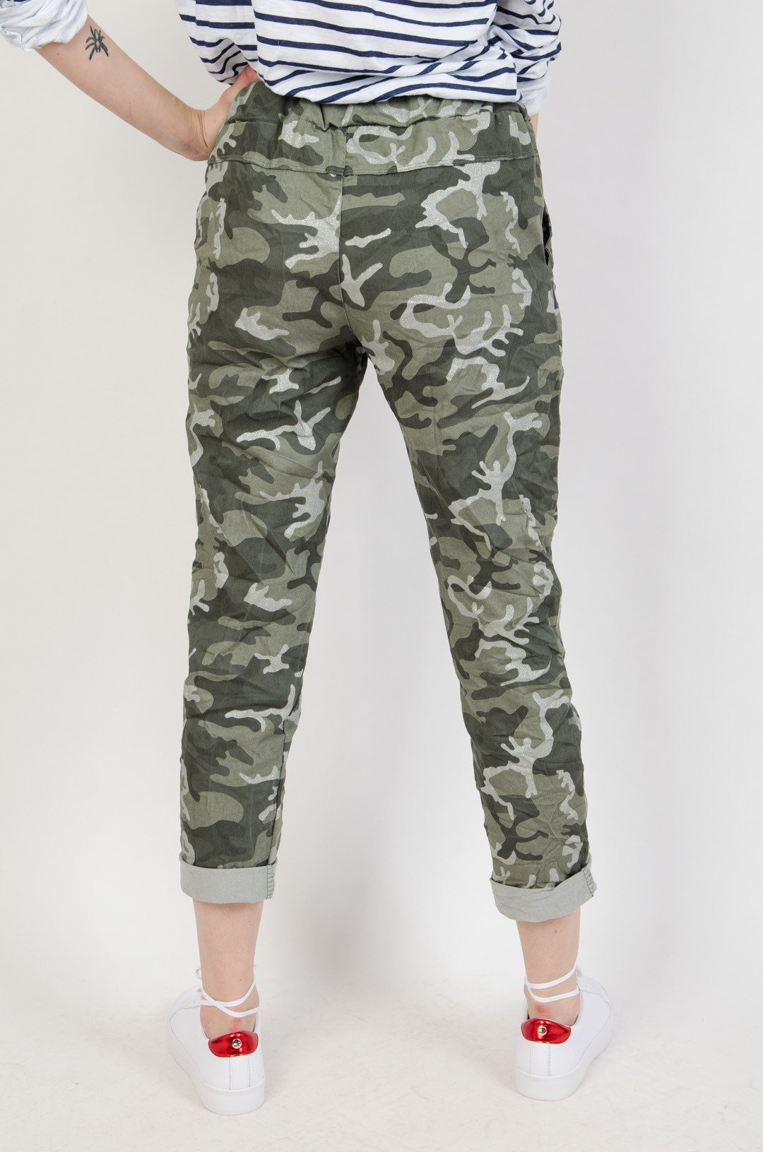 Zielono-srebrne spodnie moro z połyskującymi elementami