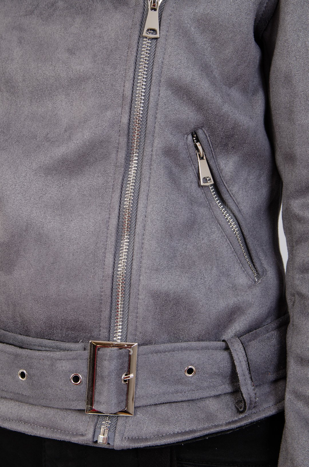 Szara zamszowa kurtka z paskiem na dole oraz srebrnymi zamkami.