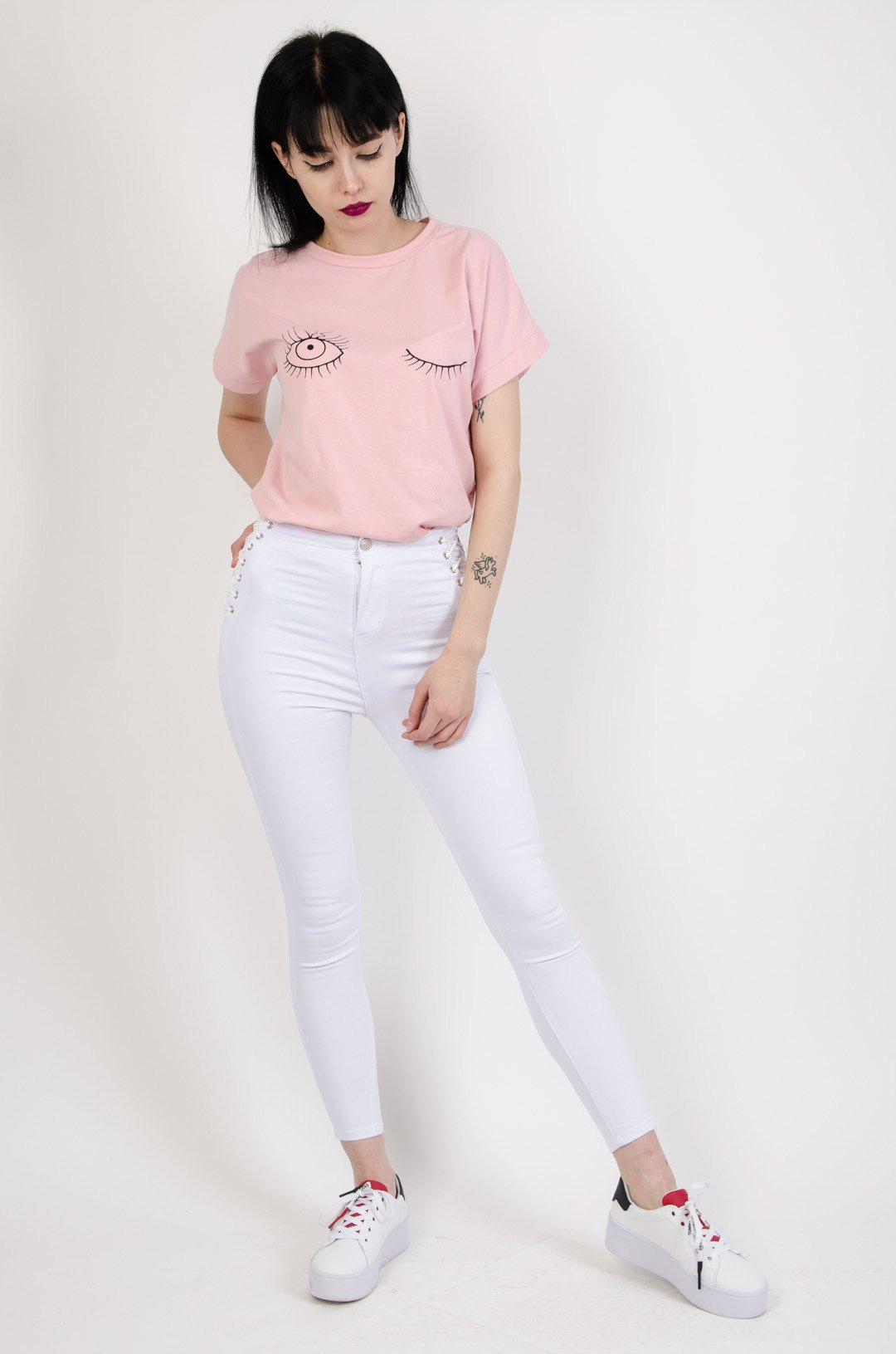 Białe jeansowe spodnie modelujące z wiązaniem na boku