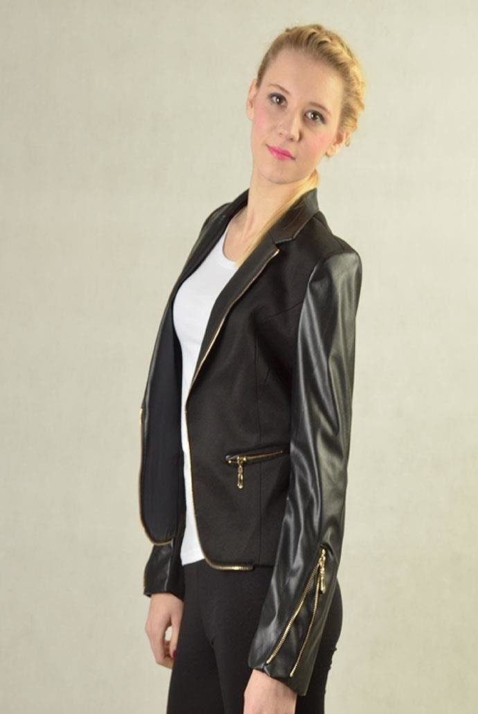 Niezwykle stylowa, taliowana i dopasowana do figury marynarka-ramoneska z łączonych materiałów. Rękawy, oraz kołnierzyk wykonany ze skóry ekologicznej. Dodatkowo na rękawach, oraz z przodu dwa ozdobne zamki. Idealna na wiele okazji.