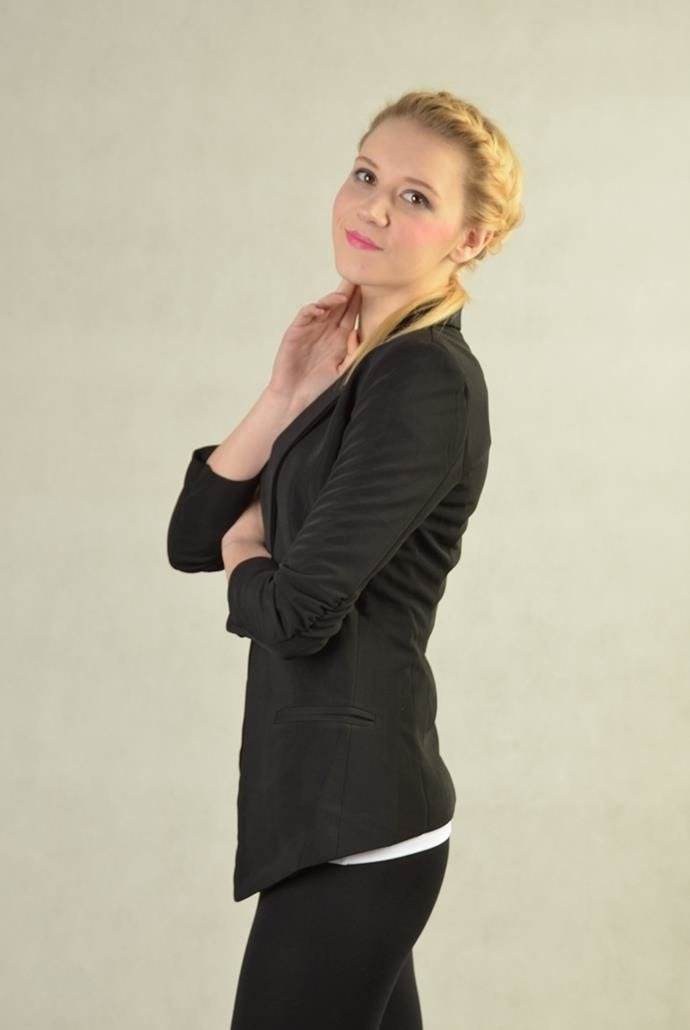 Klasyczna taliowana marynarka, zapinana na jeden guzki. Z przodu dwie ozdobne kieszenie. Rękawek ze stylowym marszczeniem, o długości 7/8.