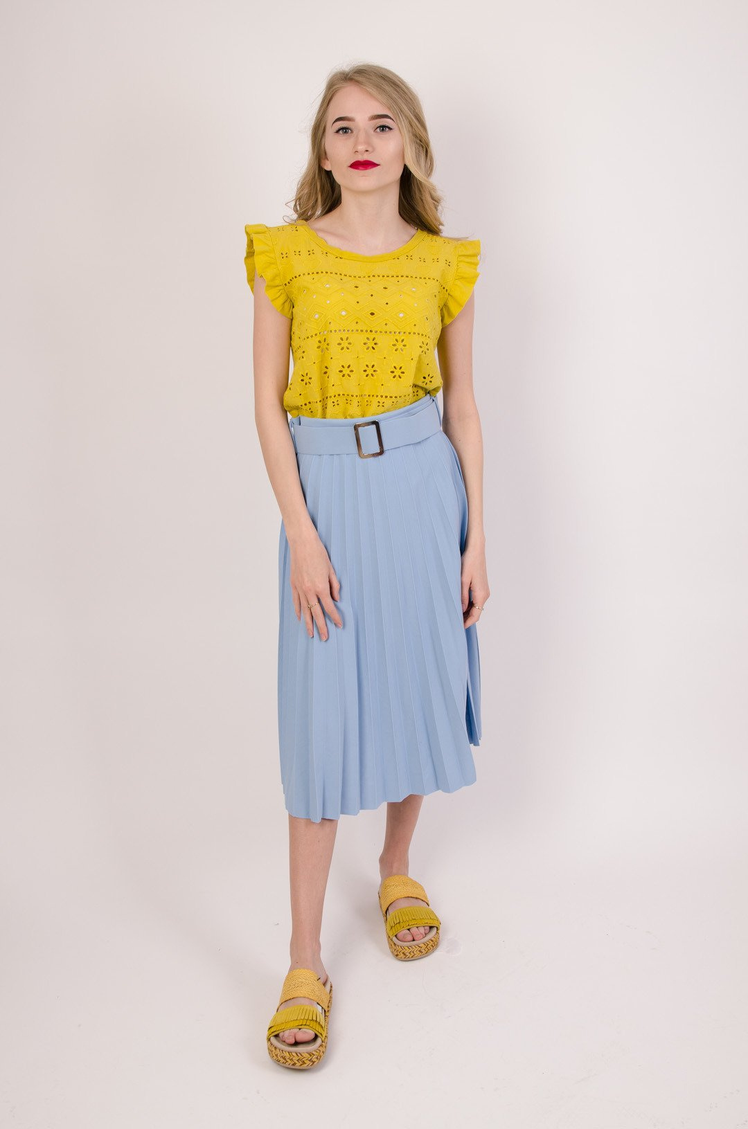 Żółta ażurowa bluzka z falbanką przy rękawie