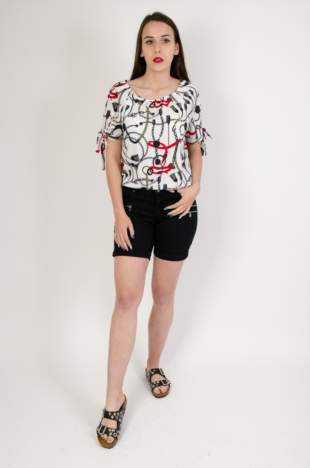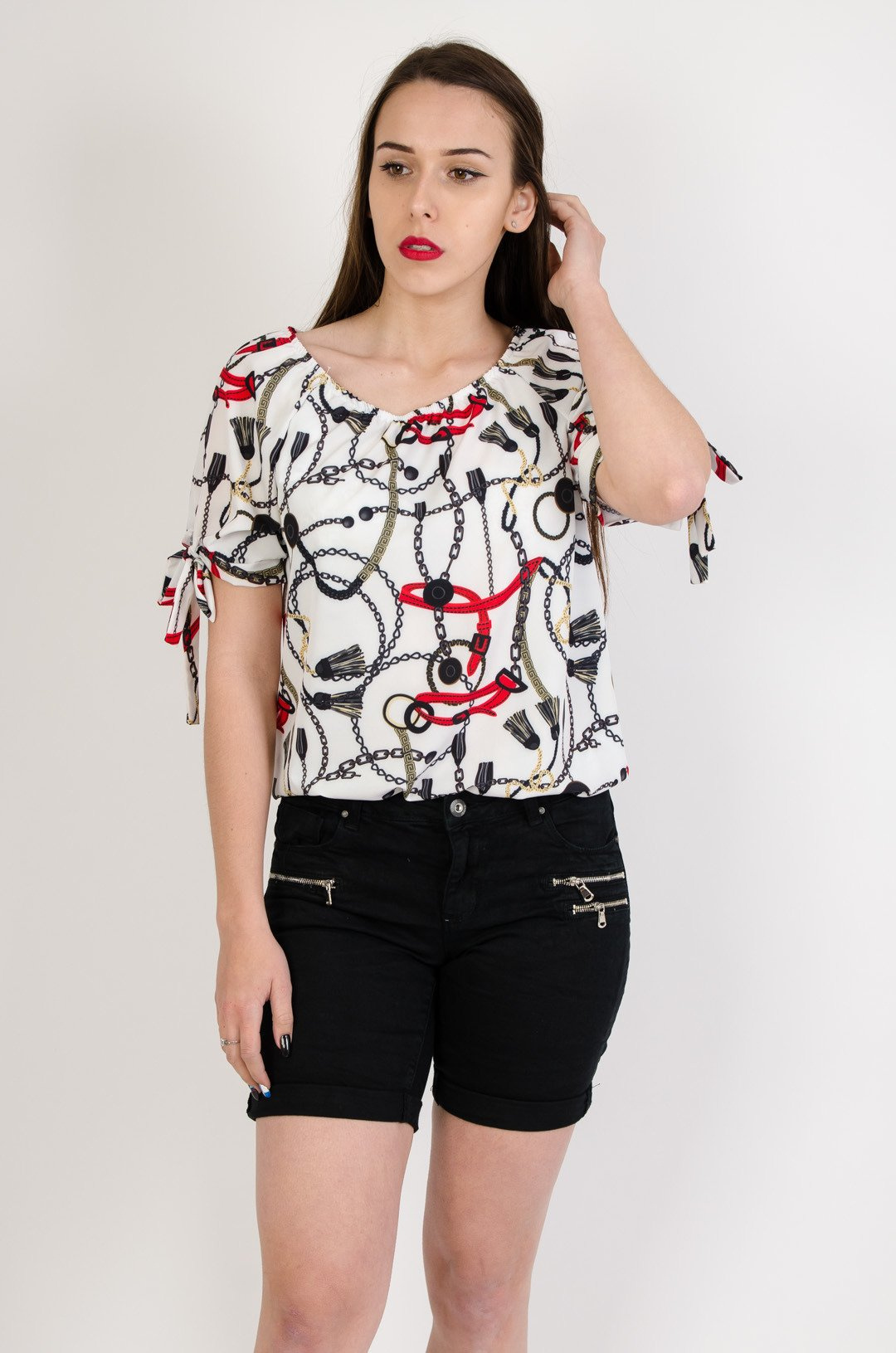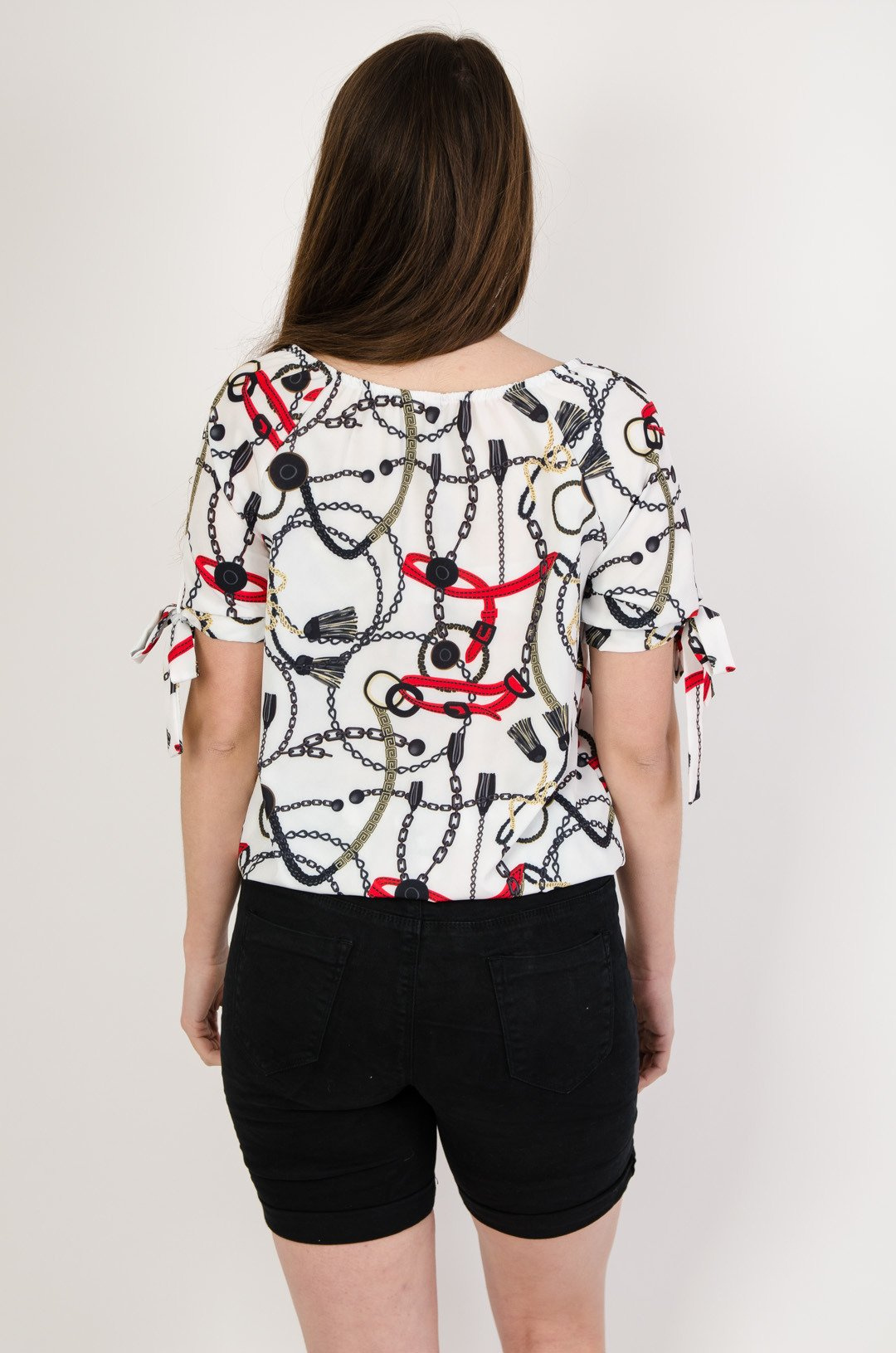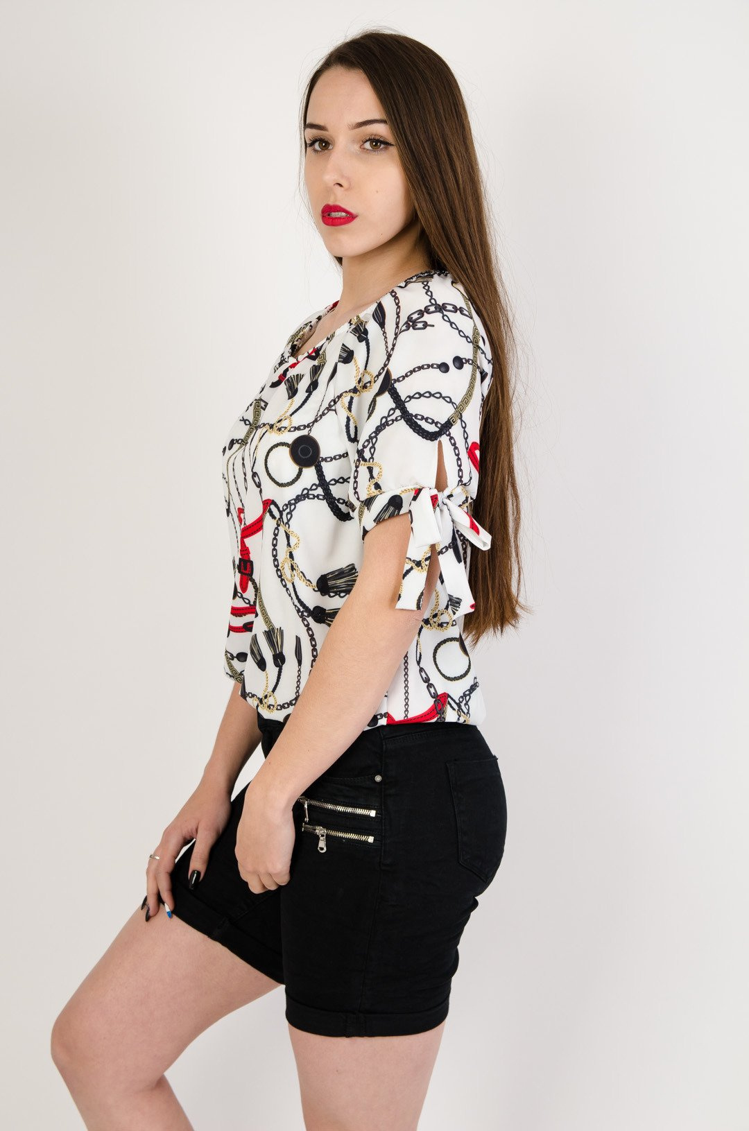 Biała bluzka z gumą na dole i wzorem pasków oraz łańcuszków