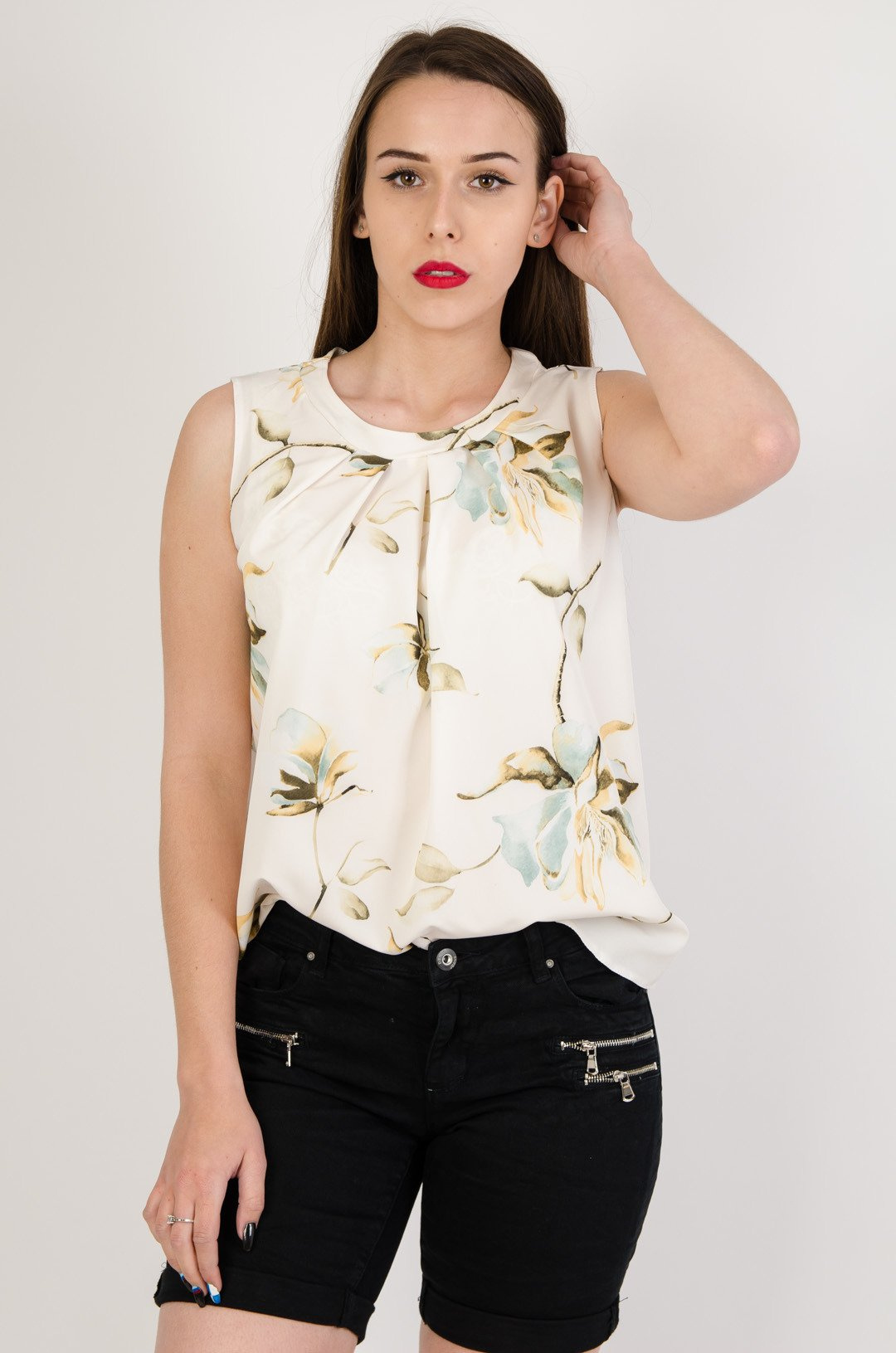 Kremowa bluzka w kwiaty z marszczeniem przy dekolcie