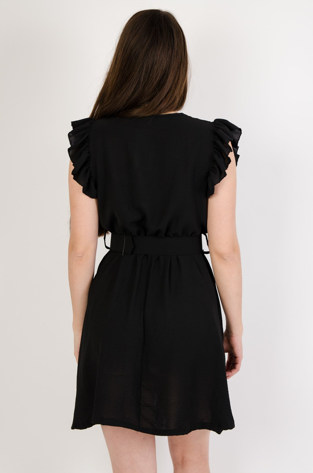 Czarna sukienka z dekoltem w serek oraz falbanką w rękawie