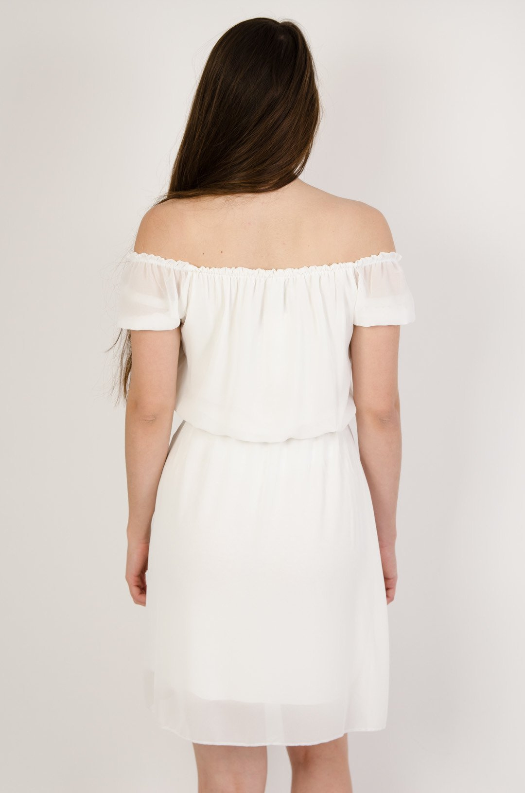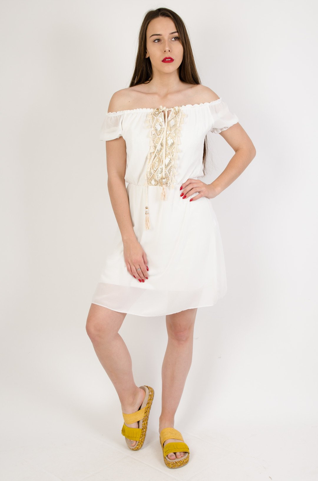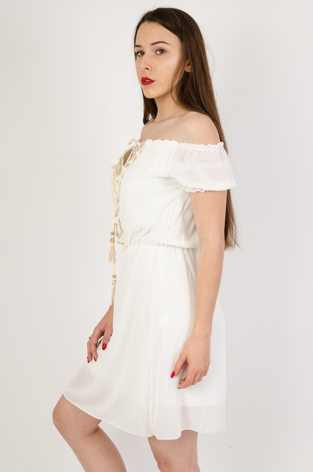 Biała szyfonowa sukienka z wiązaniem i złotymi cekinami na przodzie