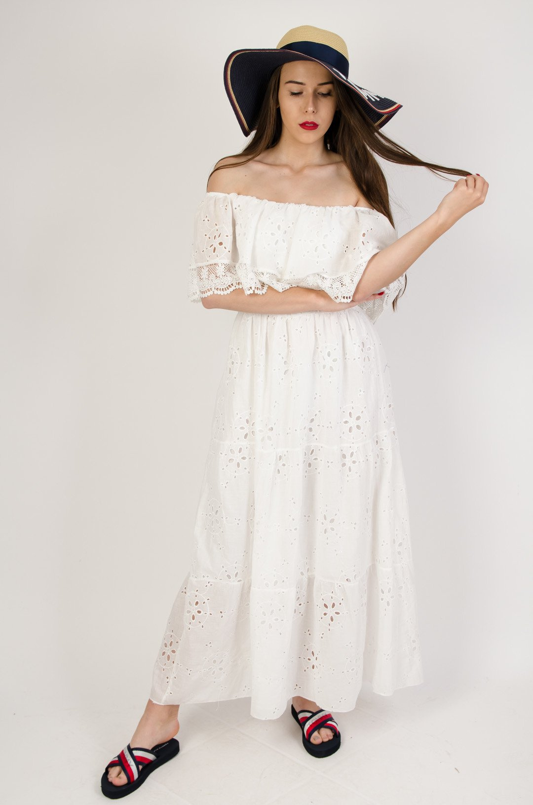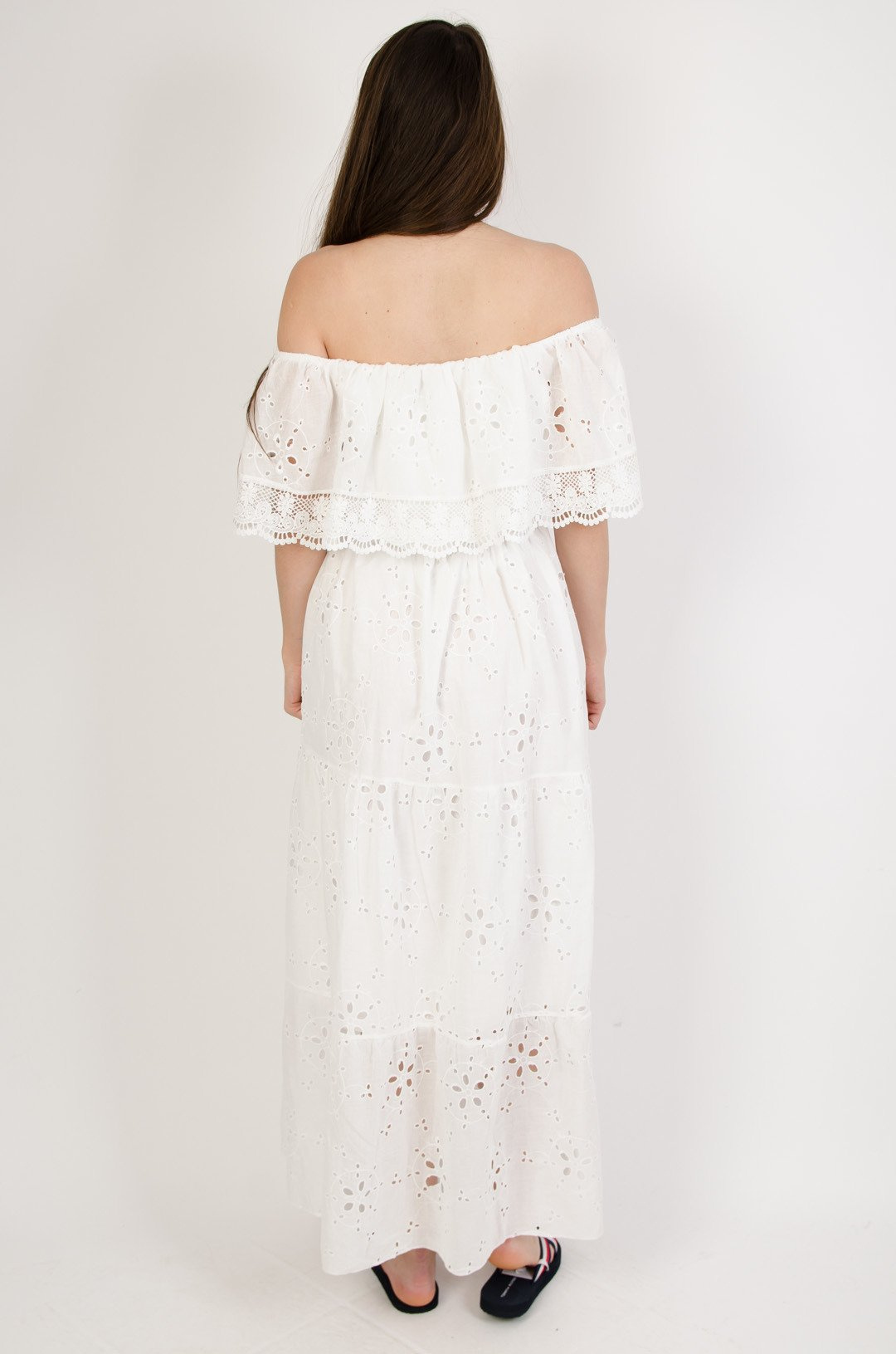 Biała długa ażurowa sukienka z hiszpańskim dekoltem zakończonym koronką