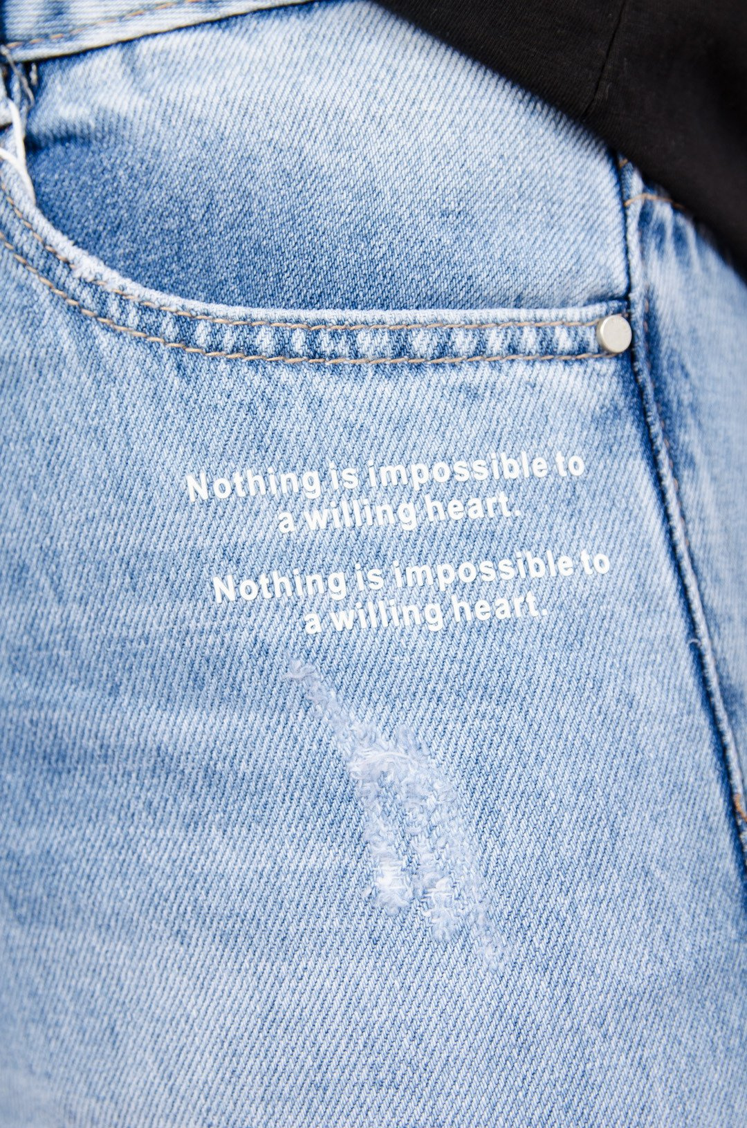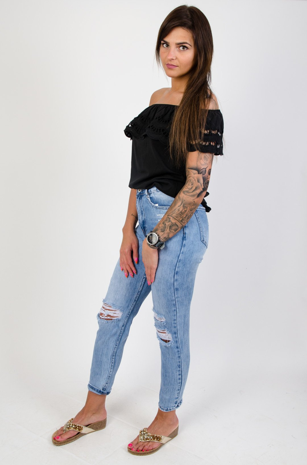 Jeansowe boyfriendy z dziurami i drobnym napisem pod kieszenią