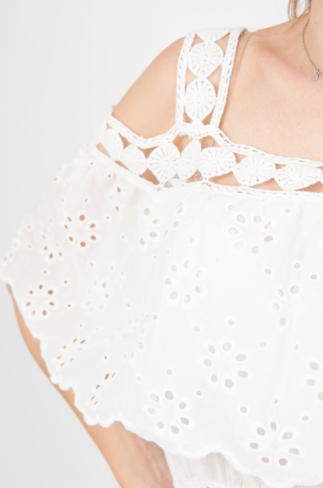 Biała ażurowa sukienka z hiszpańskim dekoltem