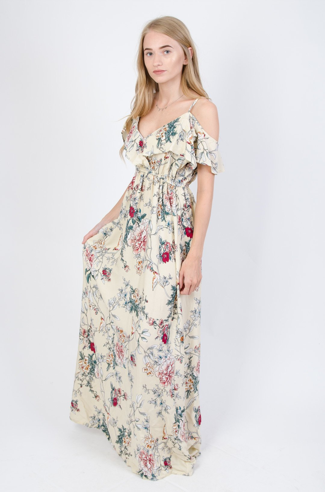 Długa kremowa sukienka w kwiaty z hiszpańskim dekoltem