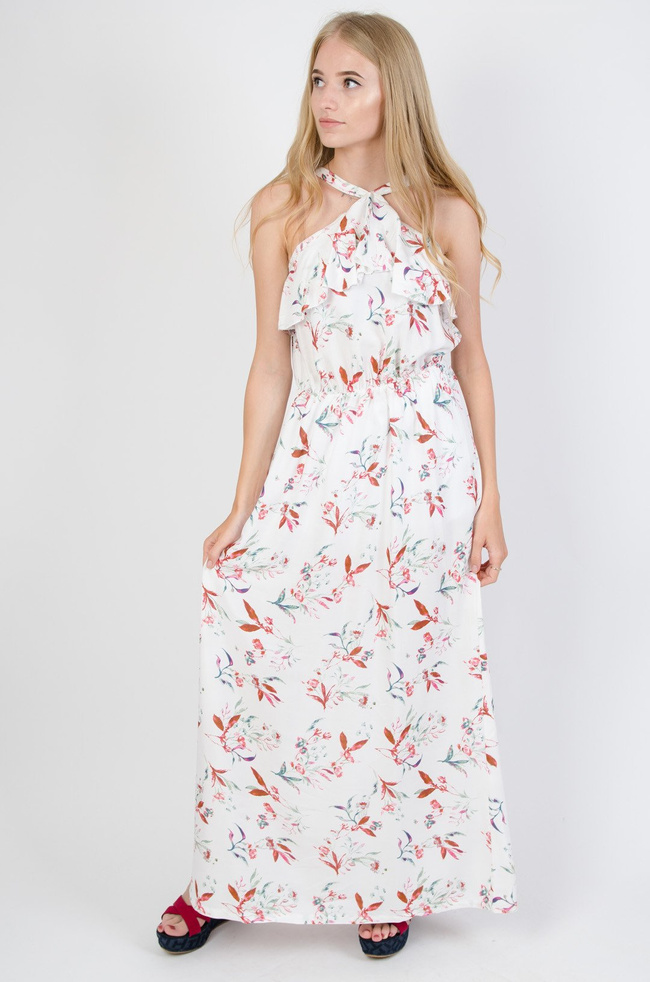 Biała sukienka w kwiaty z dekoltem pod szyję- guma w pasie, regulowane ramiączka