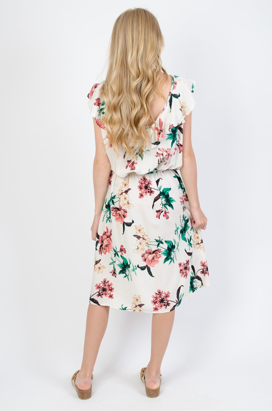 Kremowa sukienka w kwiaty z falbaną w dekolcie